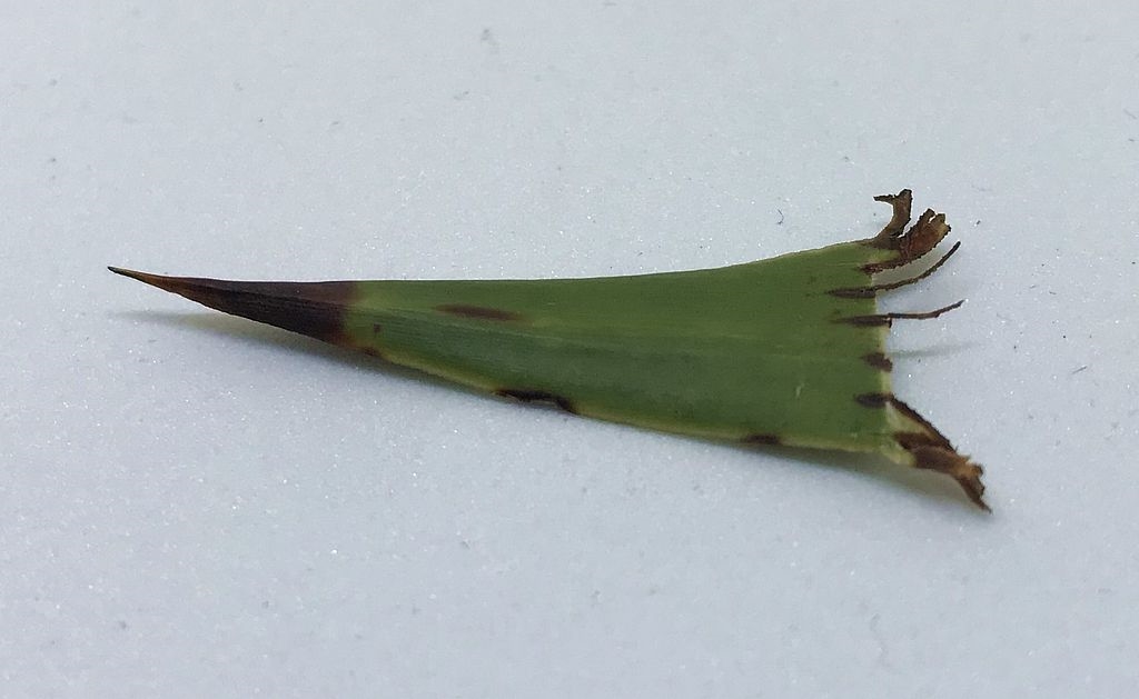 Um das schöne Bild der Äste nicht zu stören, habe ich mein Probeblatt unten am Stamm der Pflanze genommen. Es ist etwa 9 Jahre alt. Geschnitten habe ich etwa in der Blattmitte und weiter oben unterhalb des Dorns, es gibt hier jedoch keine signifikanten Unterschiede neben der äußeren Form des Querschnitts und den etwas kleineren Leitbündeln.