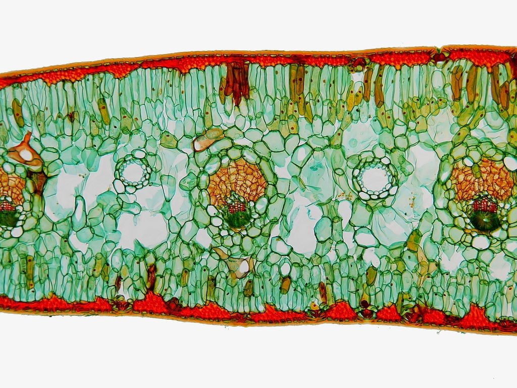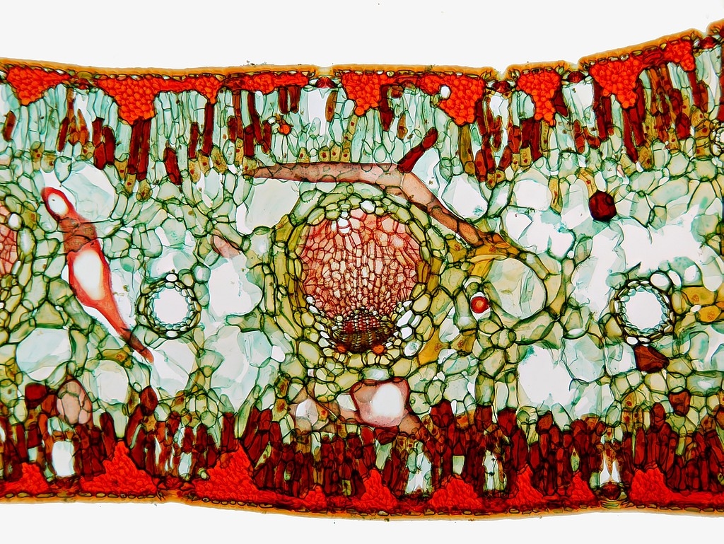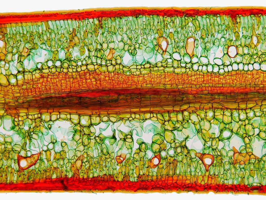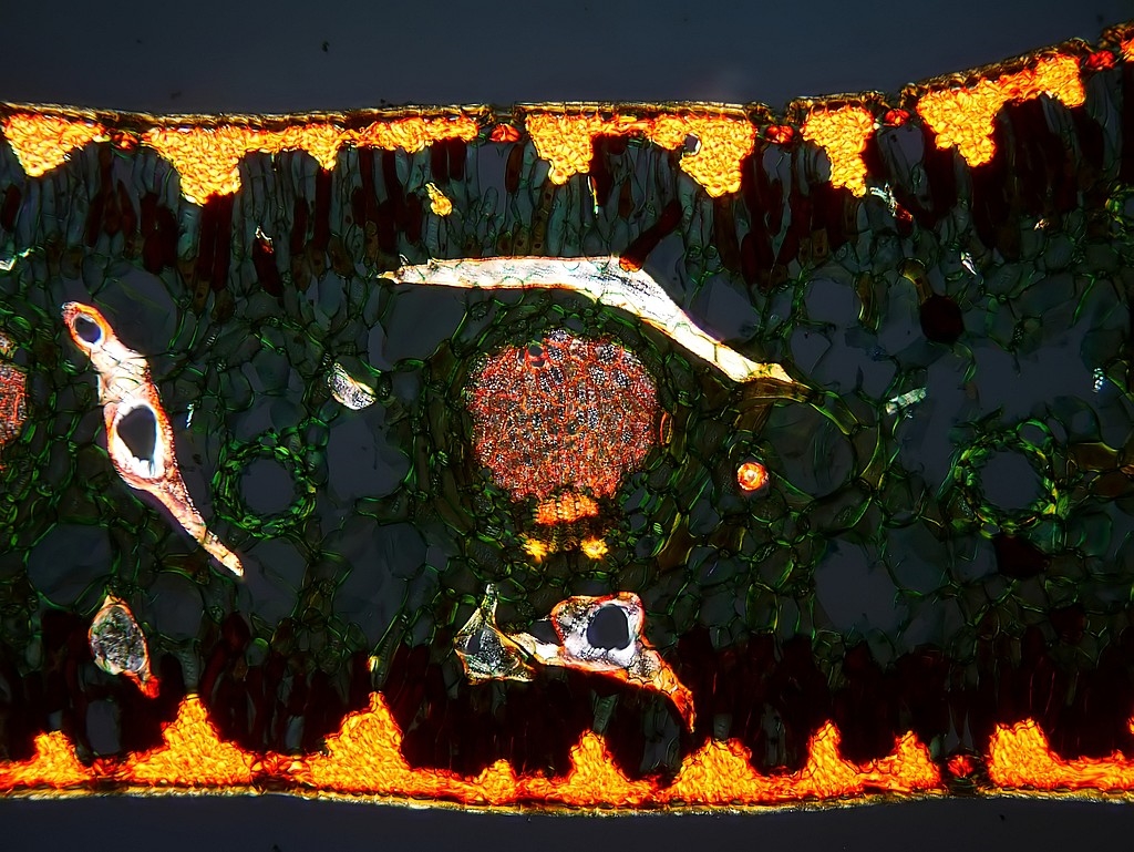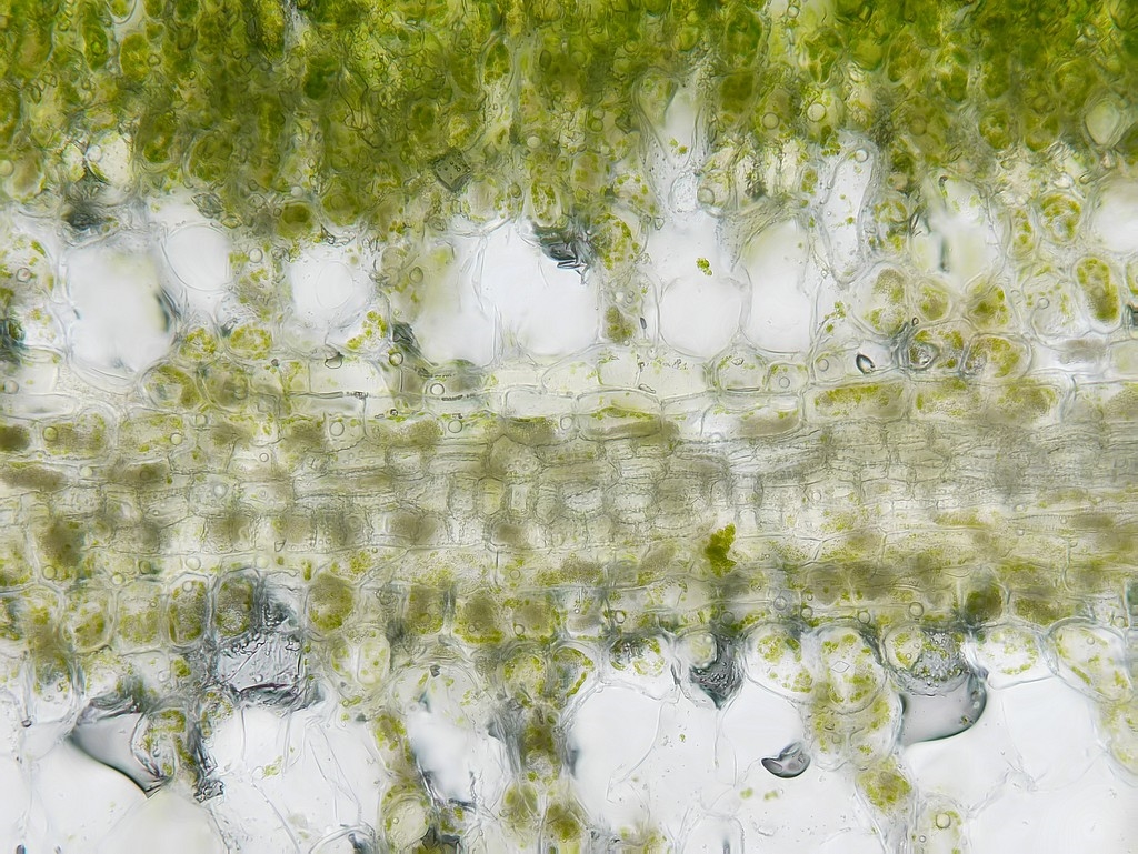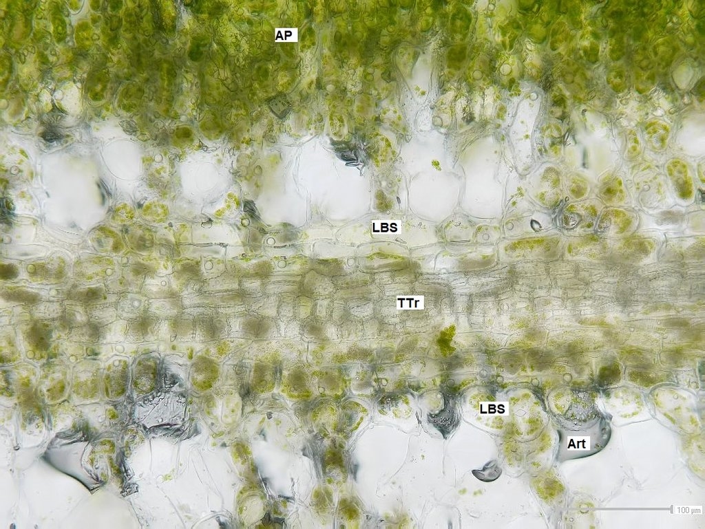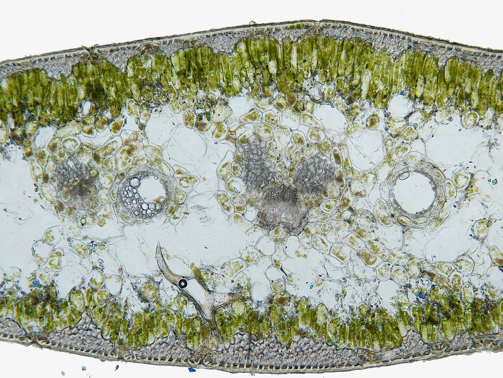 Man muss schon recht genau hin schauen, um die großen, verzweigten Zellen zwischen Assimilations- und Schwammparenchym zu entdecken.