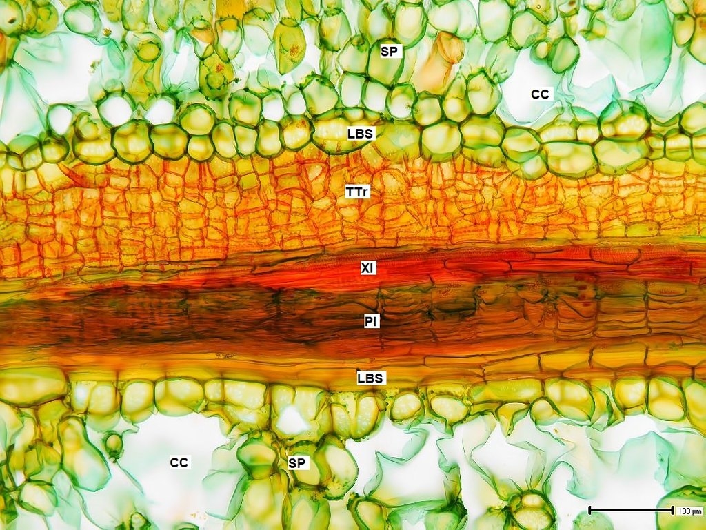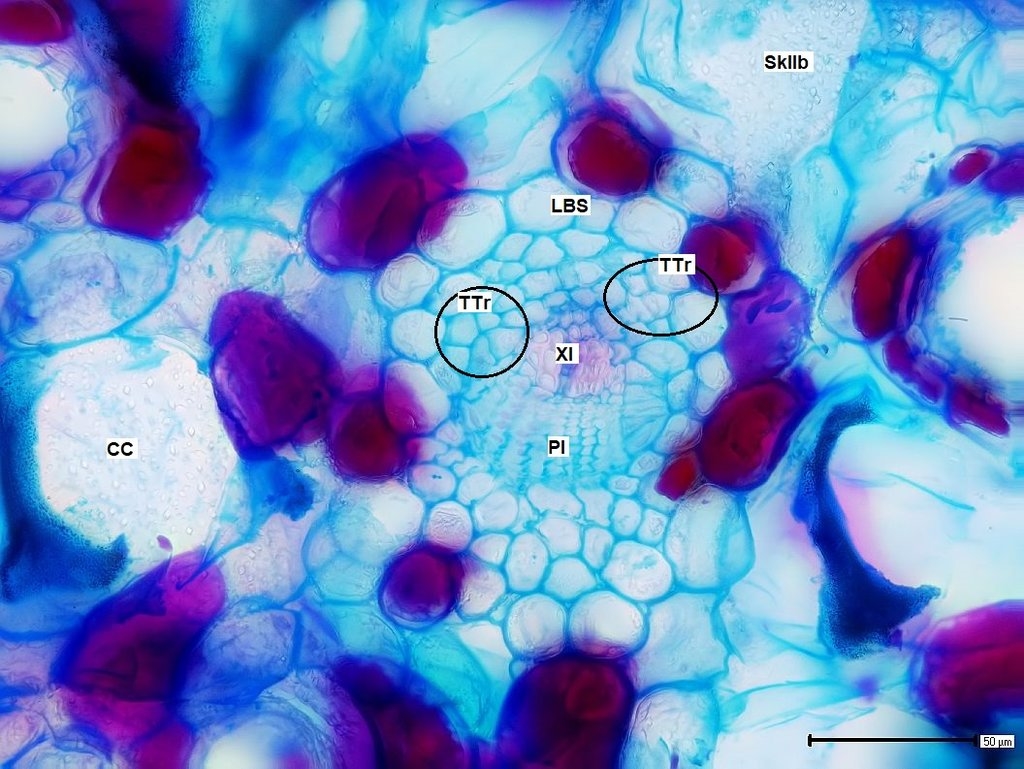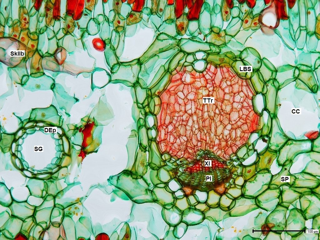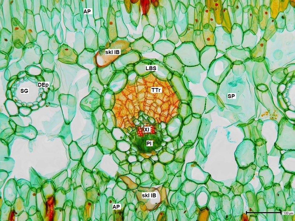 Das Auffälligste hier sind sicher die Nacréwände der Phloemzellen und das Transfusionsgewebe. Die parenchymatischen Zellen zwischen dem Xylem und den Transfusionstracheiden deute ich als Transfusionsparenchym (ohne Beschriftung). Spannend ist, dass die von den Transfusionstracheiden eingenommene Fläche größer ist, als die der "klassischen" Leitbündelgewebe Xylem und Phloem zusammen.