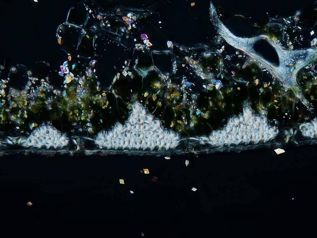 Und da sind auch unsere Calciumoxalatkristalle wieder. Hübsch aussen auf den Zellwänden der Mesophyllzellen verteilt.