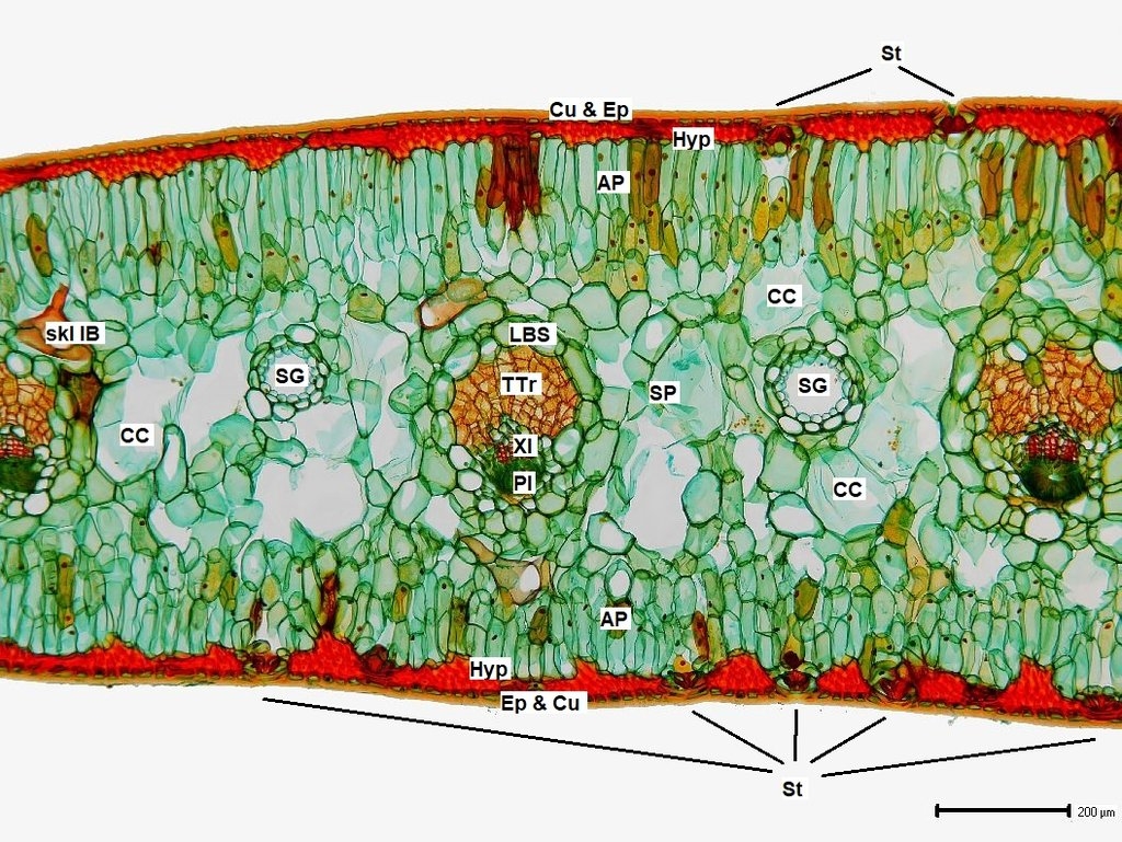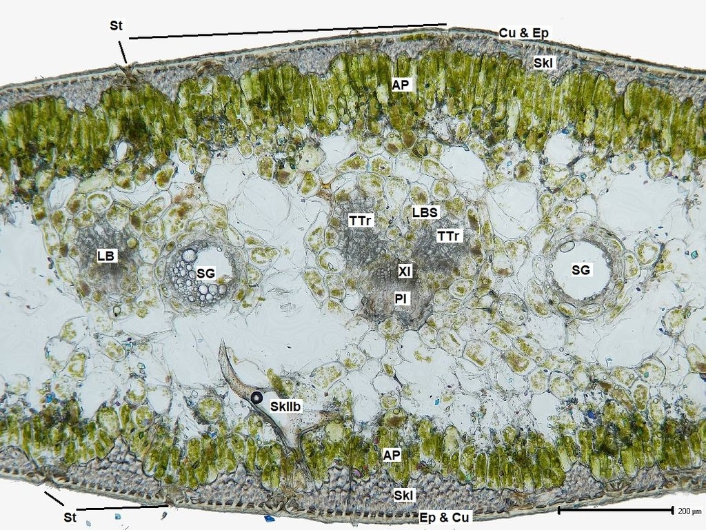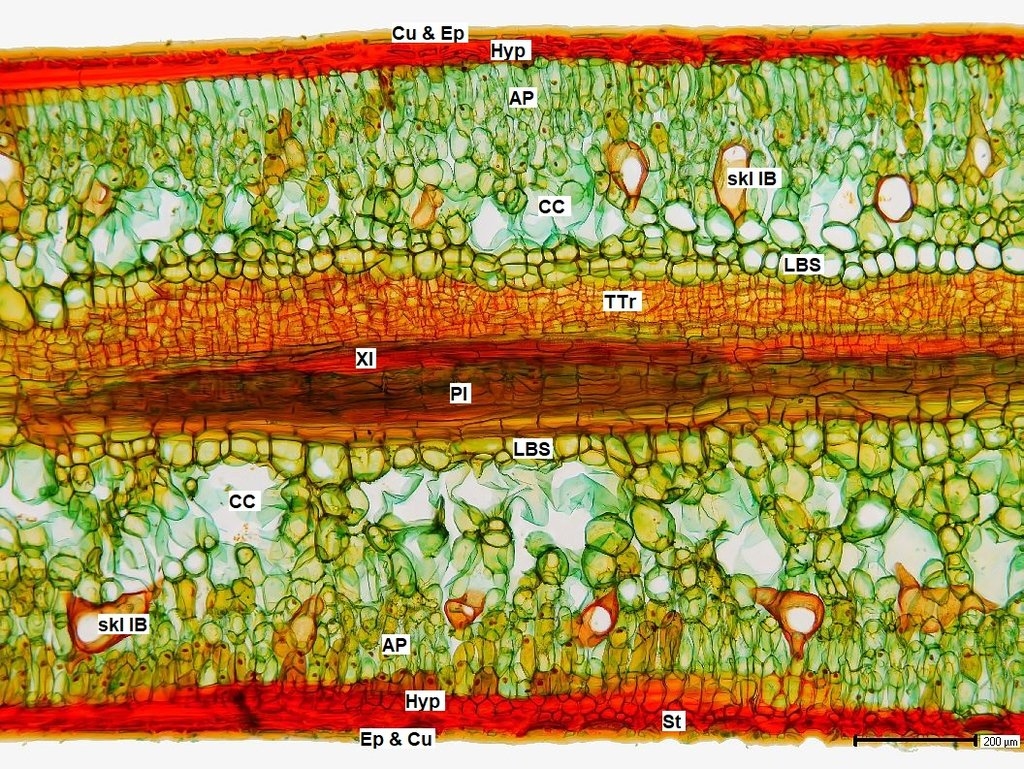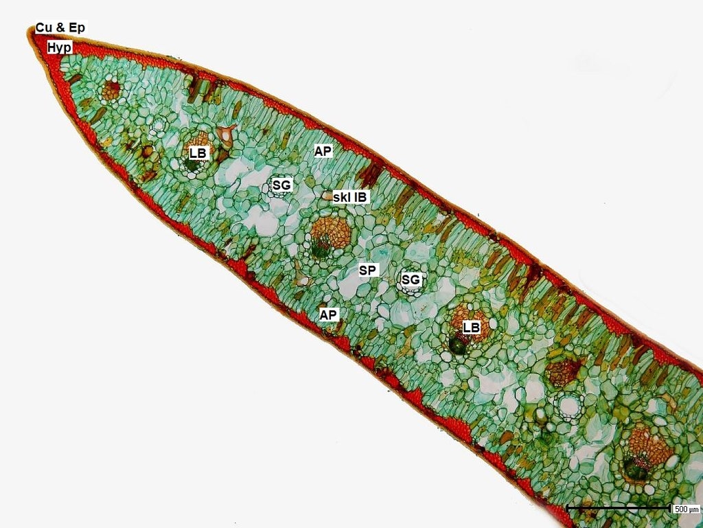 Bereits hier ist der Aufbau des Blattes gut zu erkennen: wir finden zunächst eine ausgeprägte Cuticula, unter der sich eine einreihige Epidermis befindet. Diese liegt auf einer vielreihigen, sklerenchymatischen Hypodermis, die nur an den Stomata unterbrochen ist, um Platz für einen substomatären Interzellularraum zu lassen, der aber recht klein ausfällt. Darunter liegt ein ein- bis zweireihiges Assimilationsparenchym. An der Blattunterseite wiederholt sich dieser Aufbau. In der Mitte dieser Schichten liegt das Schwammparenchym, in das die Leitbündel mit anliegenden Transfusionstracheiden und viele Sekretgänge eingebettet sind. Im Blattquerschnitt verteilt finden sich immer wieder große, sklerenchymatische Idioblasten. An der Blattunterseite gibt es eine Art stabilisierenden Kiel, bei dem die Hypodermis nicht von Stomata unterbrochen ist.