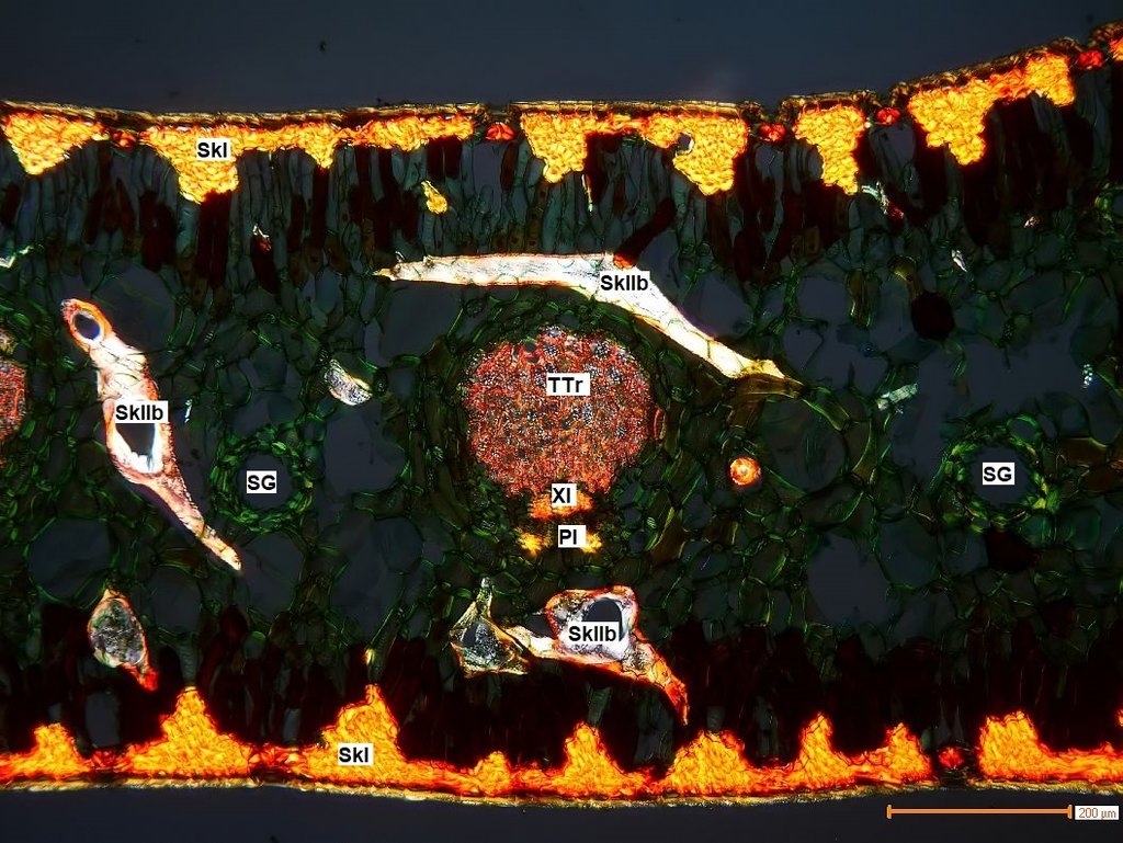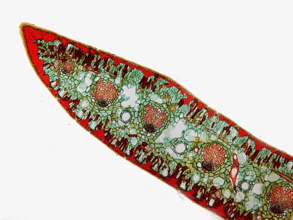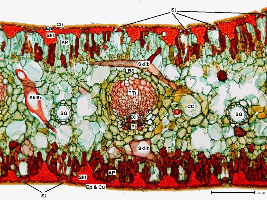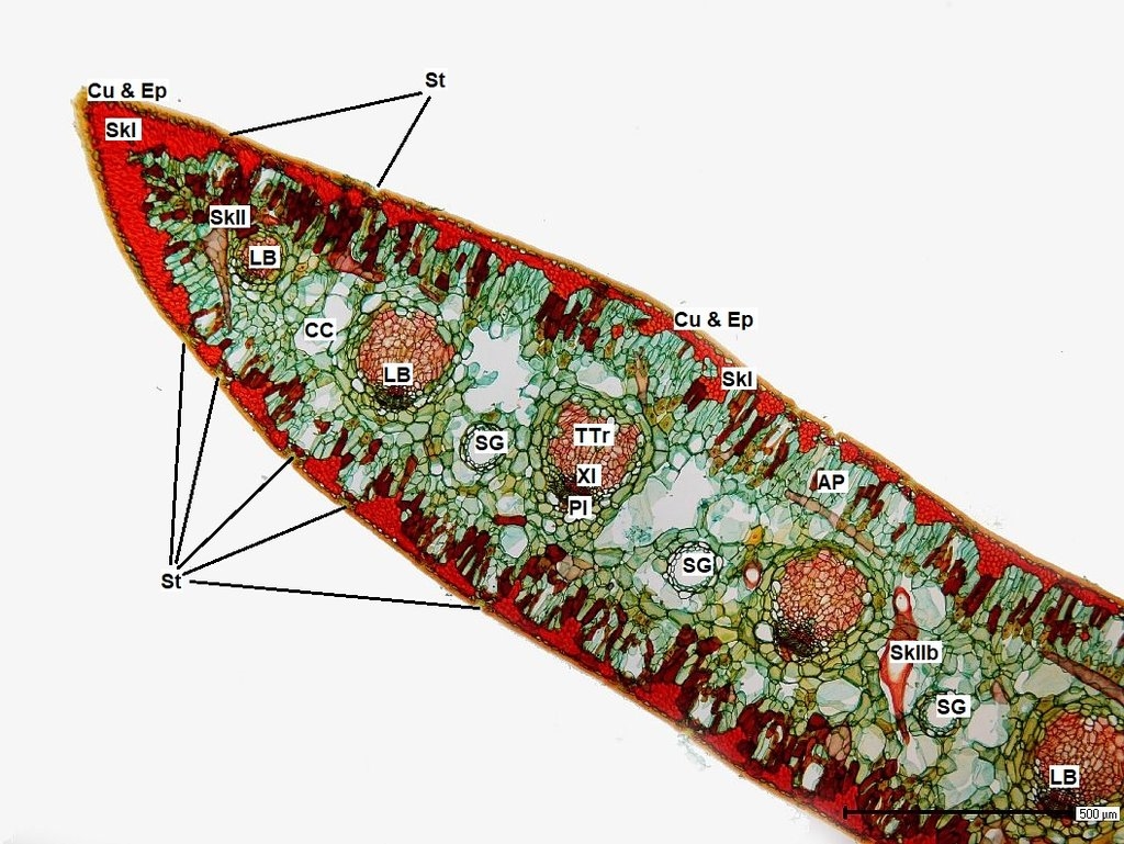 Bereits hier ist der Aufbau des Blattes gut zu erkennen: wir finden zunächst eine ausgeprägte Cuticula, unter der sich eine einreihige Epidermis befindet. Diese liegt auf einer vielreihigen, sklerenchymatischen Hypodermis, die nur an den Stomata unterbrochen ist, um Platz für einen substomatären Interzellularraum zu lassen, der aber recht klein ausfällt. Darunter liegt ein ein- bis zweireihiges Assimilationsparenchym. An der Blattunterseite wiederholt sich dieser Aufbau. In der Mitte dieser Schichten liegt das Schwammparenchym, in das die Leitbündel mit anliegenden Transfusionstracheiden und viele Sekretgänge eingebettet sind. Im Blattquerschnitt verteilt finden sich immer wieder große, sklerenchymatische Idioblasten. An der Blattunterseite gibt es eine Art stabilisierenden Kiel, bei dem die Hypodermis nicht von Stomata unterbrochen ist.