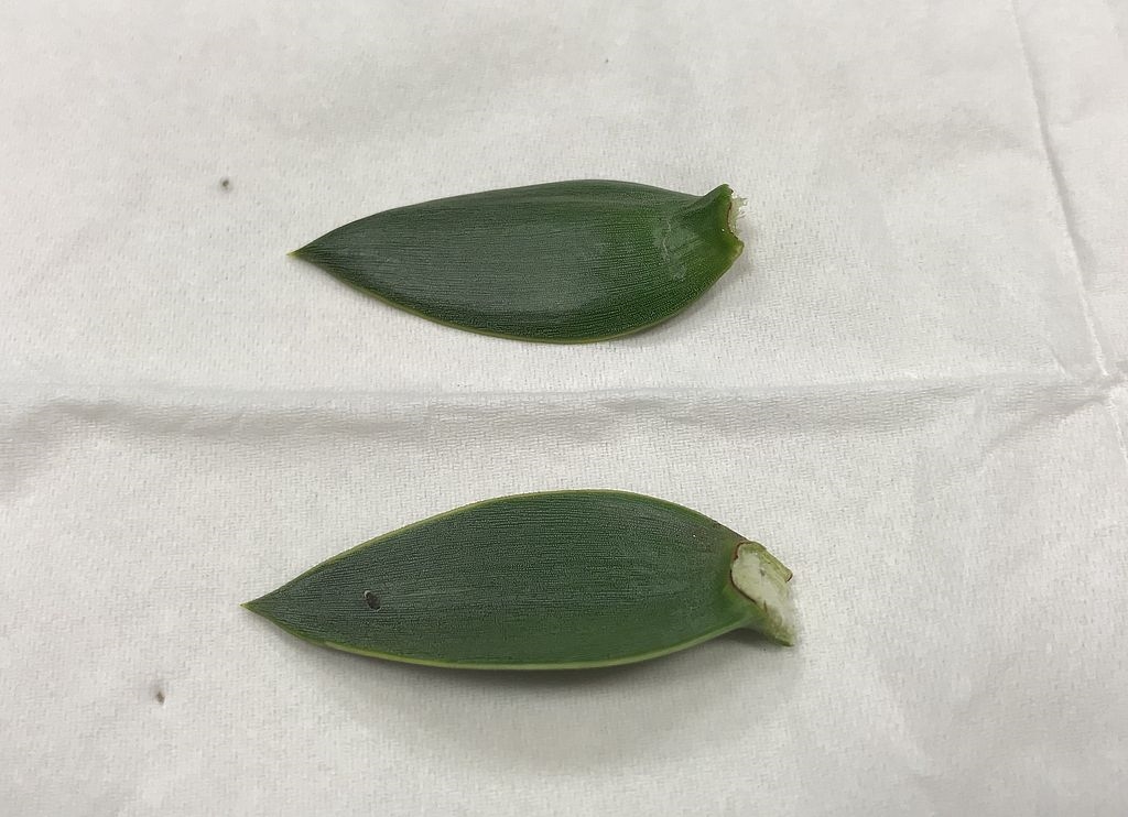 Was steckt da dahinter? Liegt es am unterschiedlichen alter der Blätter? An dem unterschiedlichen Aufbau eines frühen Blattes im Vergleich zu einem Blatt eines älteren Baums? Oder einfach daran, dass die Probe von unterschiedlichen Pflanzen stammt, die eben eine gewisse Variabilität aufweisen? Hier vielleicht bedingt durch eine bessere Wasserversorgung? Die Schnittstelle lag jedenfalls bei beiden Blättern etwa in der Mitte.