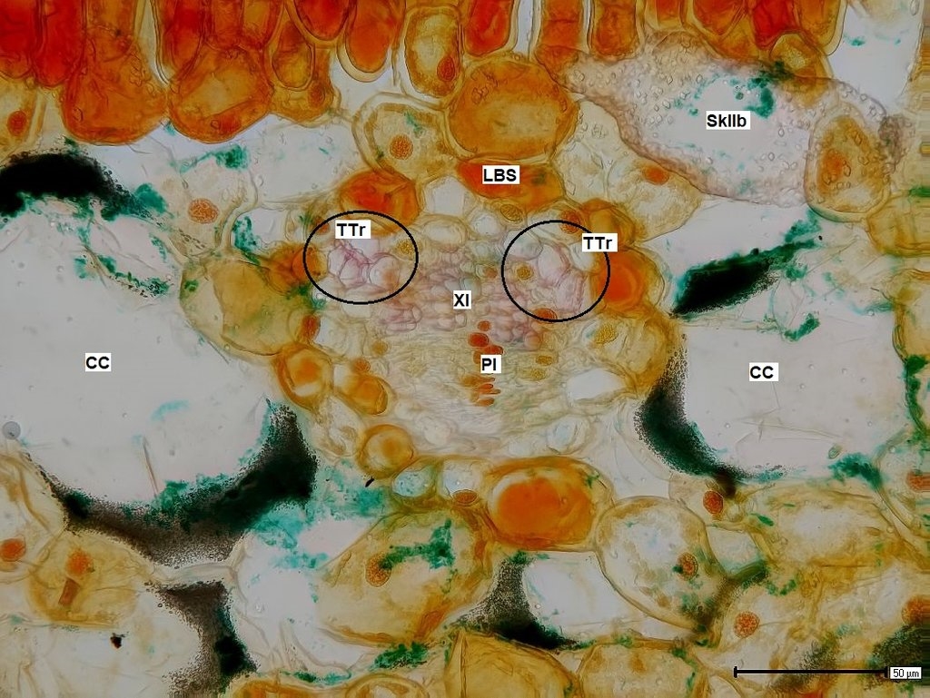 Der Schnitt verläuft jeweils nicht ganz in einer Ebene relativ zum Leitbündel, so dass die unterschiedliche Dicke der Transfusionstracheidenschicht keine Aussage birgt.