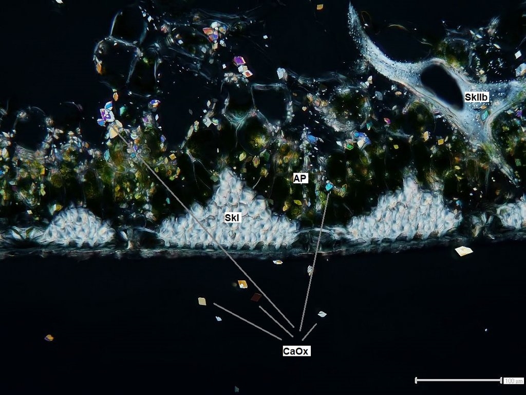 Auffällig ist hier, dass nur auf dem großen sklerenchymatischen Idioblasten Calciumoxalatkristalle zu finden sind. In der ersten Probe waren diese auch auf den Parenchymzellen des Mesophylls vorhanden (vergleiche Bild 14c). Ein Umstand der sicher dem geringen Alter des Blattes und eventuell auch einer anderen Bodenbeschaffenheit geschuldet ist.