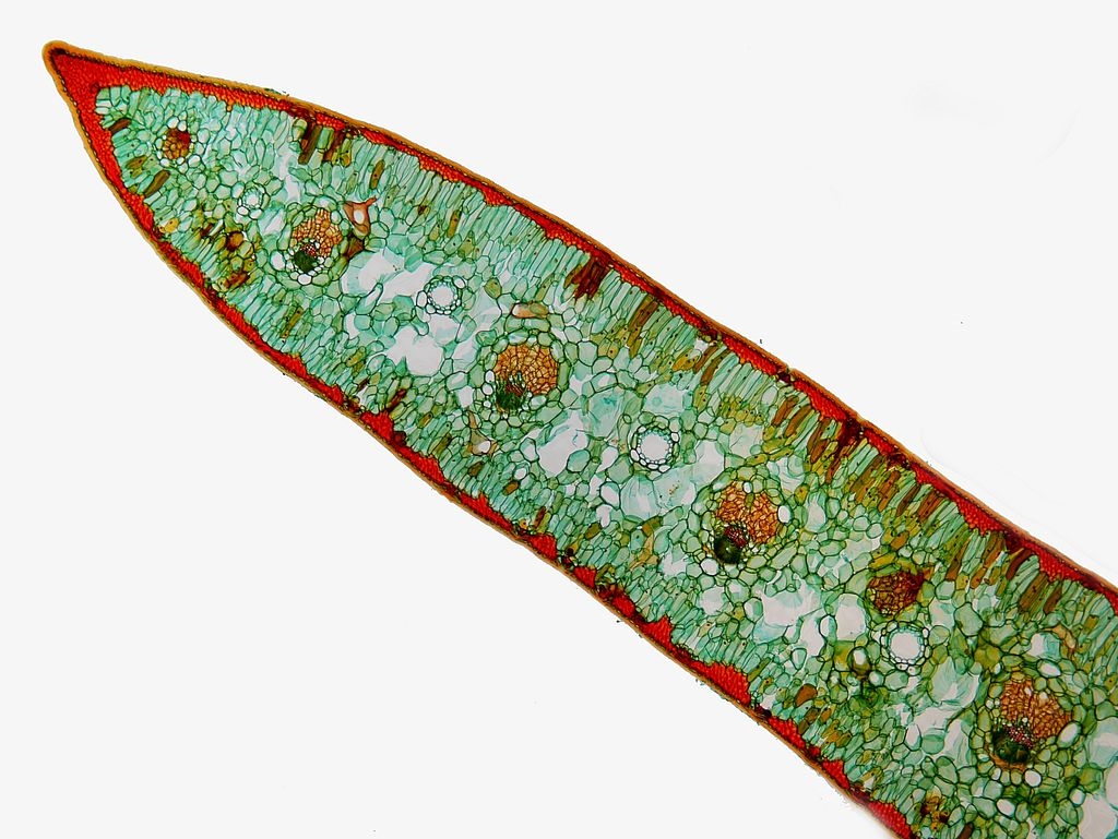 Am Blattrand finden wir die gleichen Features wie in der Blattmitte. Zum Rand hin werden die Leitbündel kleiner und es gibt auch dort ein massives Stück Hypodermis zur Versteifung. Selbstredend sind auch wieder Sekretgänge und Idioblasten zu finden.