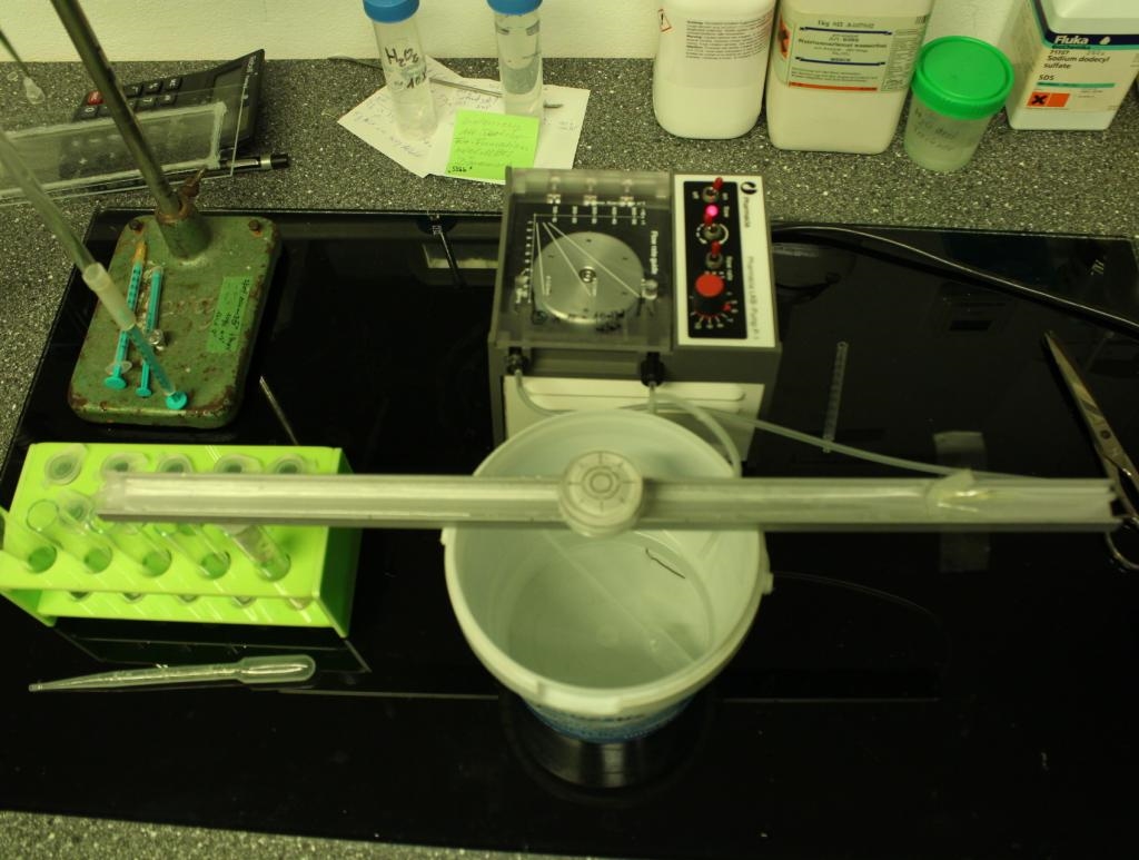 Eine Art Goldwaschrinne bestehend aus einem Alu-U-Profil in das eine Linsenrasterfolie https://de.wikipedia.org/wiki/Linsenrasterbild#/media/File:Close_up_of_the_surface_of_a_lenticular_print.jpg als runde Rinne eingeklebt (0,12 mm Raster quer zur Laufrichtung) - und leicht geneigt ist. Über eine Pumpe wird diese mit einem permanenten Flüssigkeitsstrom (Detergenz mit pH 10) gefördert und die Probe als möglichst hohes Konzentrat in einem geringen Volumen am höchsten Punkt der Rinne aufgegeben.