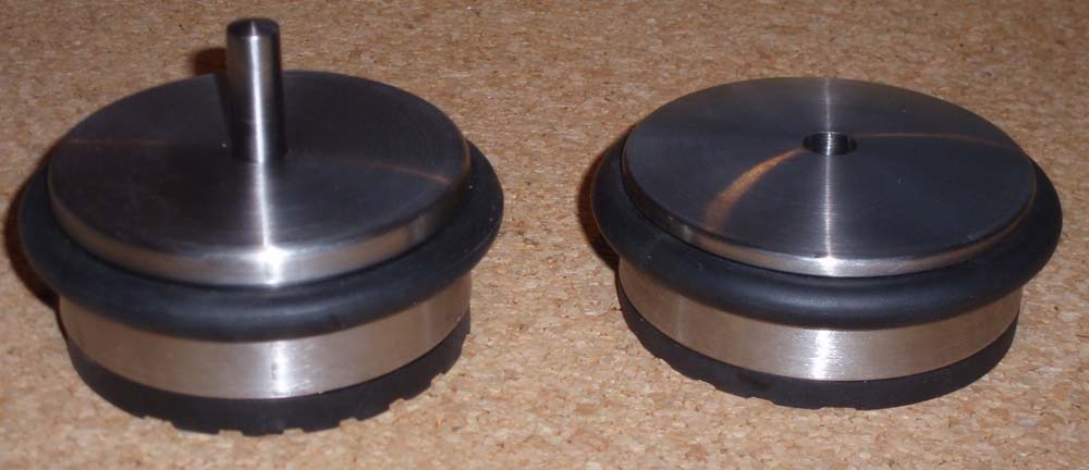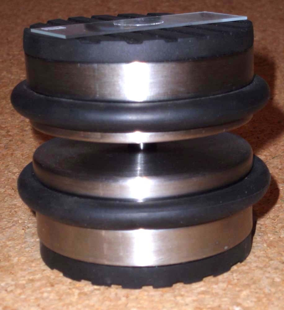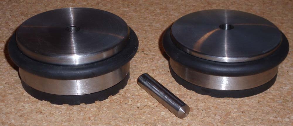 Leider sind die Bilder nicht mehr aufrufbar. Aber mit etwas Einfühlungsvermögen kann man sich die Konstruktion vielleicht nach meinen Beschreibungen vorstellen. Sie besteht in der "Sparausführung" lediglich aus zwei schweren metallischen Türstoppern aus dem Baumarkt (die lassen sich dann auch noch gemäß der ursprünglichen Bestimmung verwenden) und einem kurzen Bolzen. Sie kann aber auch noch ausgebaut werden, z. B. mit zwei Objektklammern und einer beliebigen Zentriermarkierung.