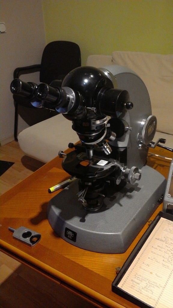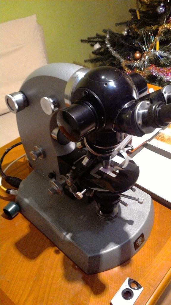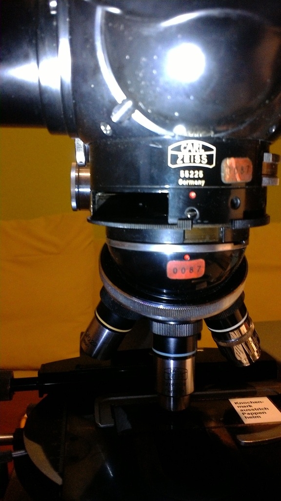 die Auktion, aus der Dein Phomi zu stammen scheint, hatte ich beobachtet. Es ist eine frühe Version des ersten Modells, das einen von allen späteren Versionen abweichenden Anschluss (seitlich geklemmt Ringschwalbe) für Objektivrevolver (oder Einzelobjektivhalter und Auflicht-Kondensoren) besitzt. VORSICHT damit: löst Du die Klemmschraube, purzelt Dir der Objektivrevolver ohne Vorwarnung auf Präparat oder Objekttisch! Auch der Analysatorschieber ist nicht ohne weiteres austauschbar, da er (im Unterschied zu den späteren Versionen) eine Telanlinse enthält.