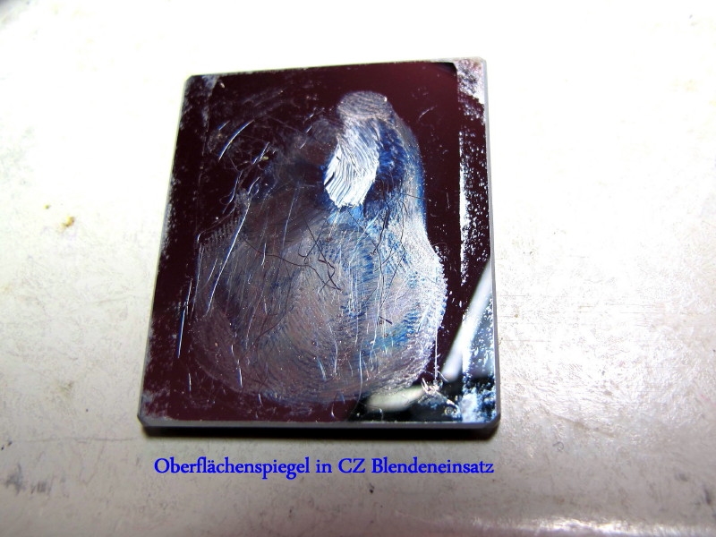 Hier mal ein Beispiel eines total verschmutzten Spiegels aus dem LFB-Einsatz; ich konnte ihn tatsächlich durch abspülen mit Isopropanol wieder sauber bekommen. In diesem Fall ein Oberflächenspiegel, der keine Putzorgien verträgt.