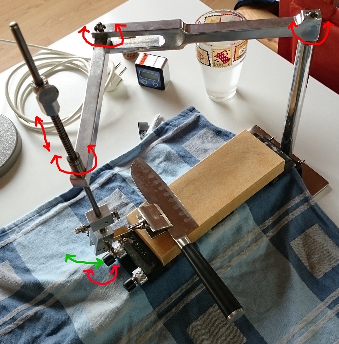 In der Schleifbewegung ist man durch die rot markierten Achsen fast vollkommen frei. Anfangs wird lediglich unten links (grün markiert) der Schleifwinkel mit Hilfe eines kleinen digitalen Winkelmessers fest eingestellt. Der Seitenwechsel erfolgt durch Umklappen des bronzefarbenen Teils um 180°; alternativ kann das Messer auch mittels eines Neodymmagneten (mit in Mittelstellung befindlichem Bronzeteil) fixiert werden. Aufgrund der Federung ist hier auch die Möglichkeit einer Kontrolle des Schleifdrucks gegeben (nach Untersuchungen von Leuten, die noch wesentlich krasser drauf und erfahrener als ich sind, soll das die Schnitthaltigkeit steigern, sowohl bei Seilschnittwettbewerben wie auch in Profiküchen).