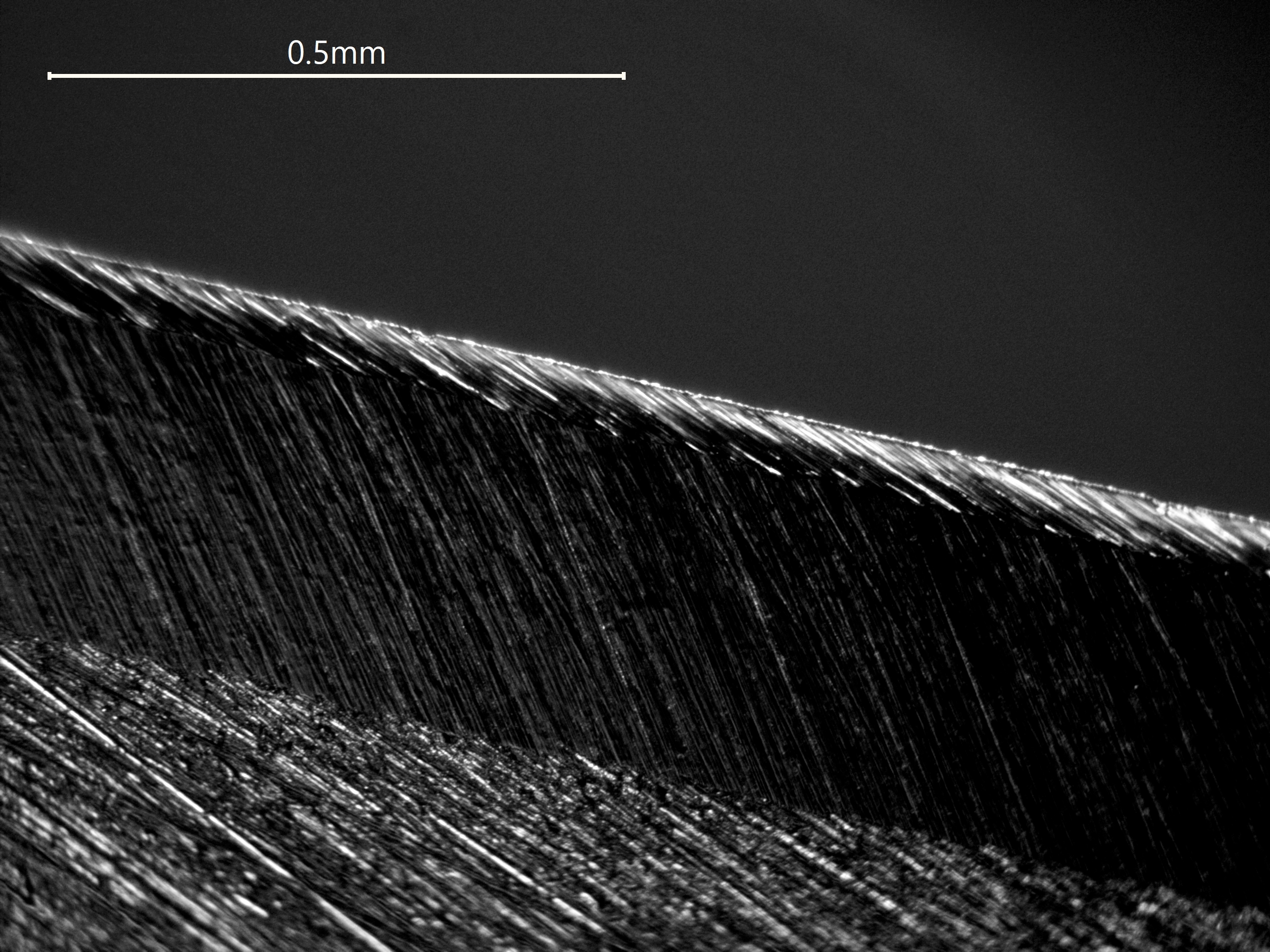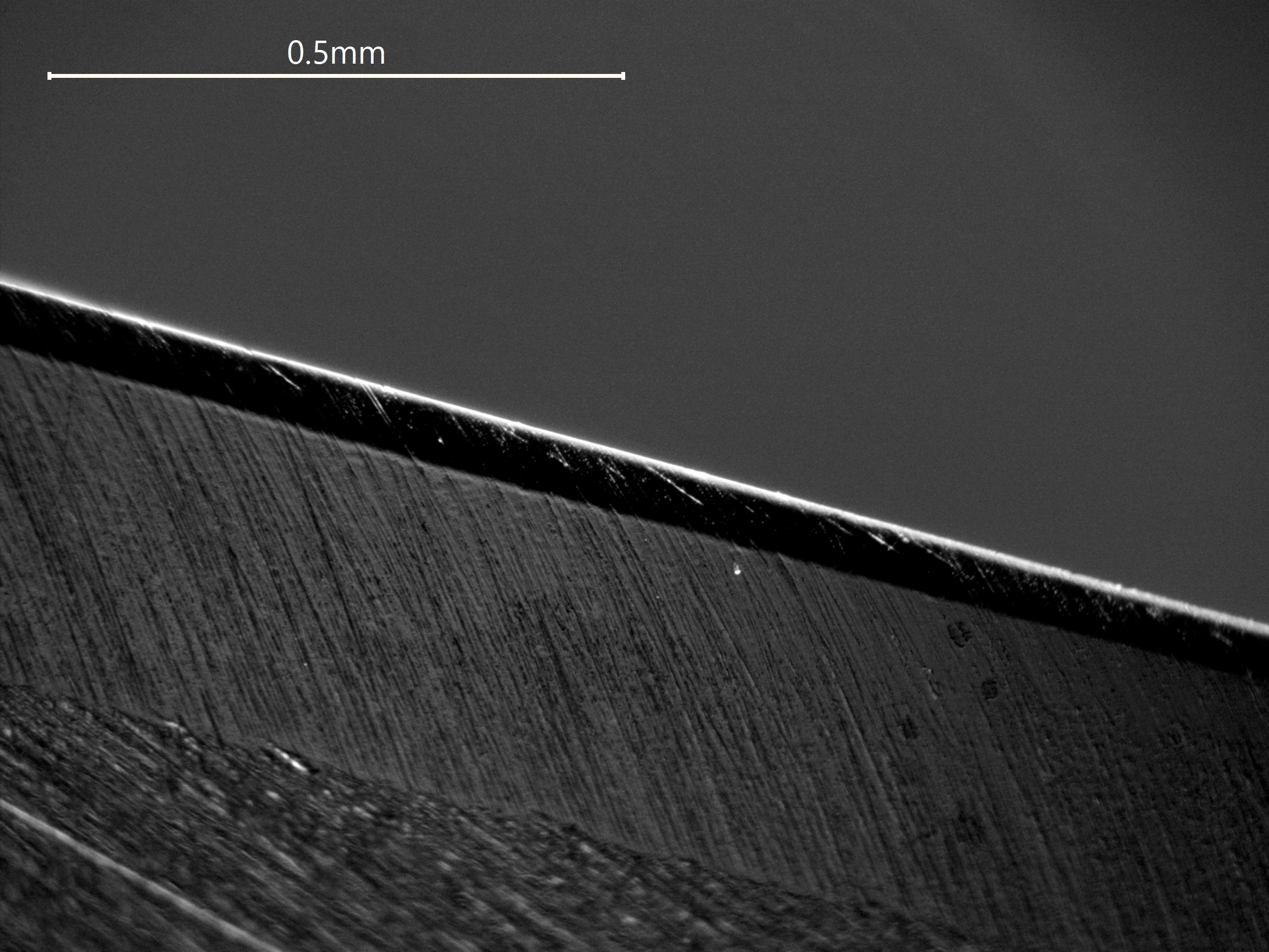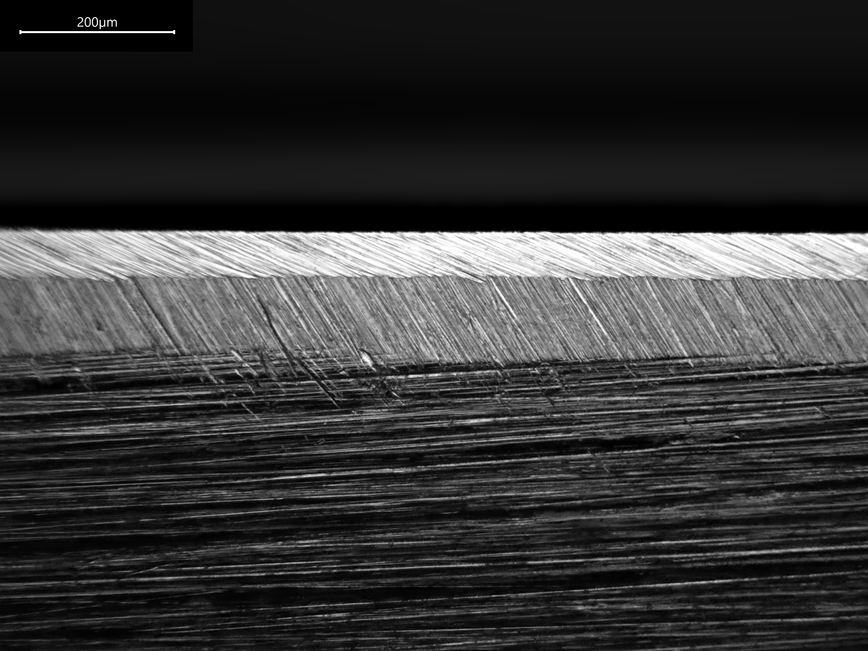 Erst im zweiten Fall werden die Riefen auf der ca. 0.06 mm großen Schneide vernünftig sichtbar. Beim Schärfen wechsele ich zwischen verschiedenen Körnungen die Schärfrichtung, sodass nach oben rechts oder oben links gerichtete Riefen entstehen. So weiß ich, wann ich mit einer "nächsthöheren" Körnung durch bin (also dann, wenn die anders ausgerichteten Riefen der niedrigeren groben Körnung mit "alter" Richtung komplett verschwunden sind). Daher dachte ich, dass Dunkelfeld vorteilhaft sein sollte, da die Riefen reproduzierbar immer (?) sichtbar sein sollten, da Licht aus allen Richtungen kommt.