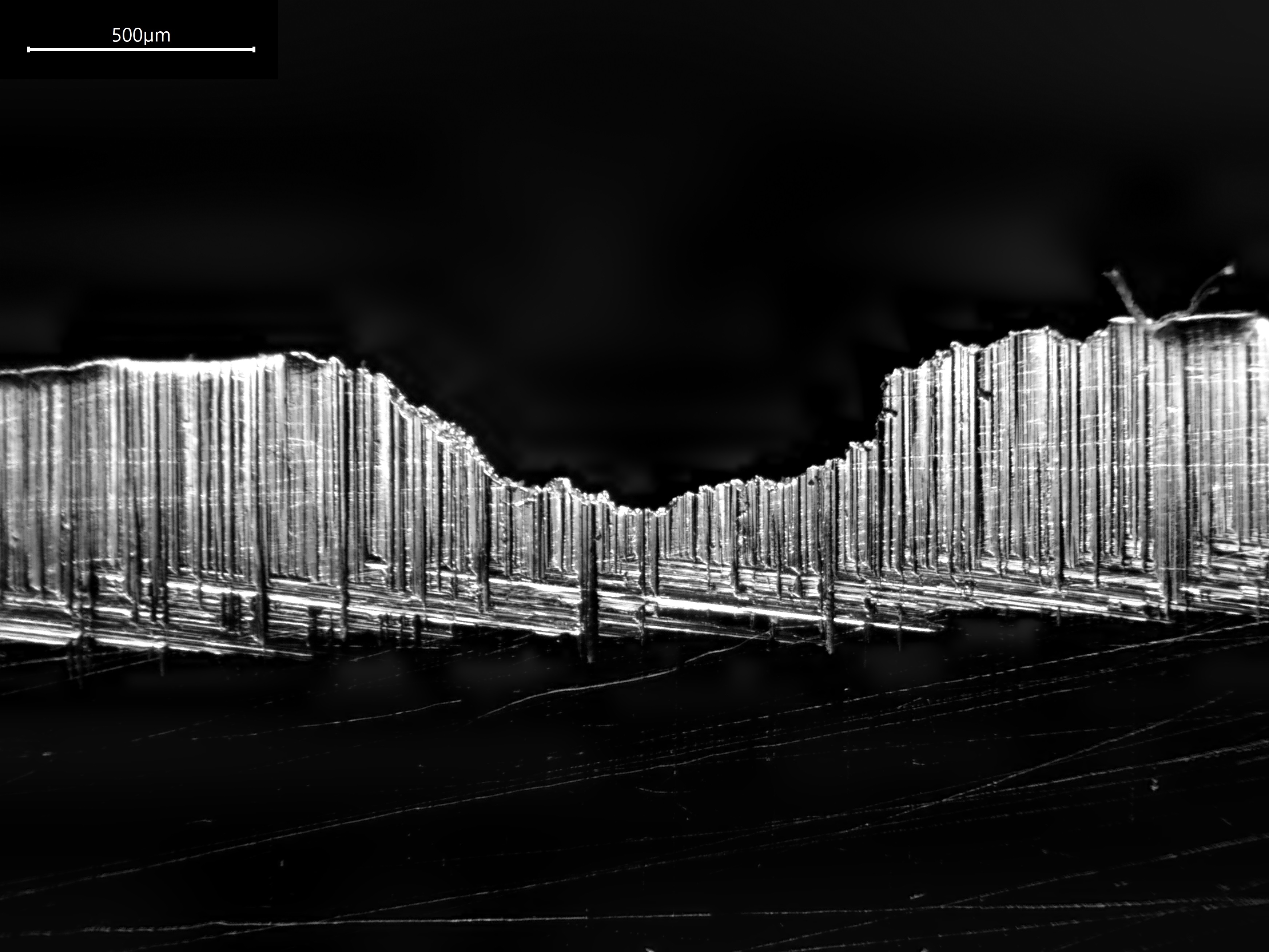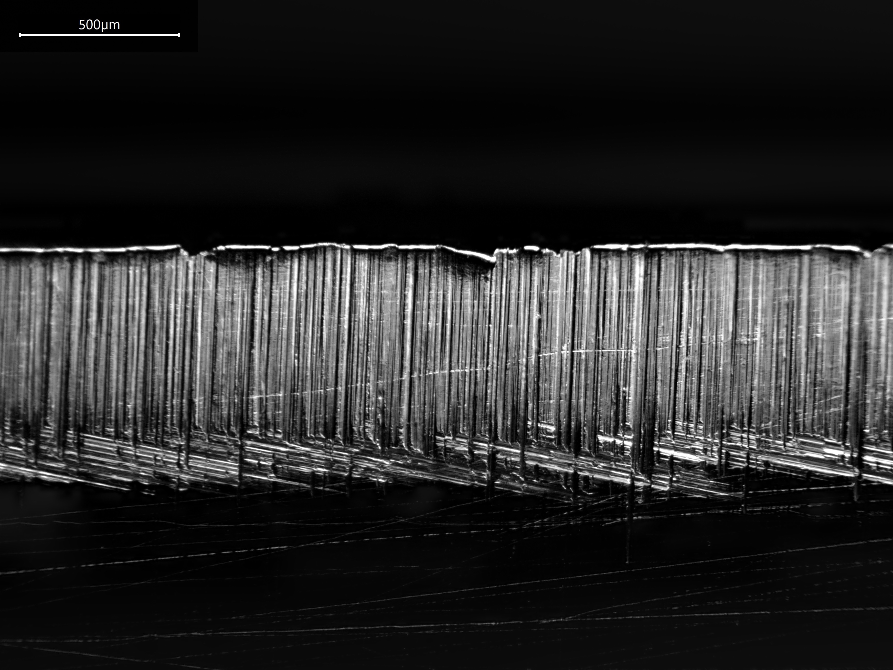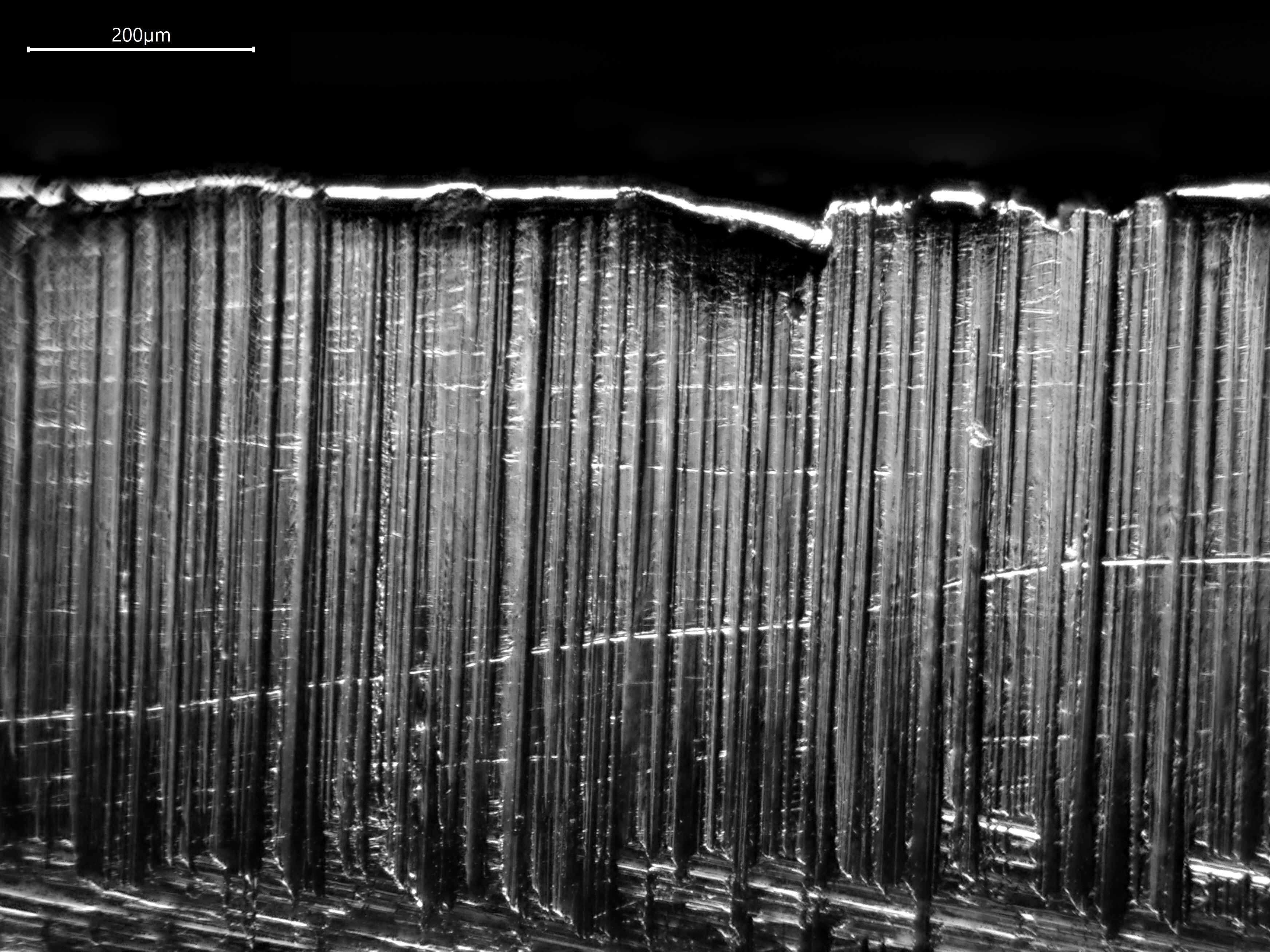 Erst im zweiten Fall werden die Riefen auf der ca. 0.06 mm großen Schneide vernünftig sichtbar. Beim Schärfen wechsele ich zwischen verschiedenen Körnungen die Schärfrichtung, sodass nach oben rechts oder oben links gerichtete Riefen entstehen. So weiß ich, wann ich mit einer "nächsthöheren" Körnung durch bin (also dann, wenn die anders ausgerichteten Riefen der niedrigeren groben Körnung mit "alter" Richtung komplett verschwunden sind). Daher dachte ich, dass Dunkelfeld vorteilhaft sein sollte, da die Riefen reproduzierbar immer (?) sichtbar sein sollten, da Licht aus allen Richtungen kommt.