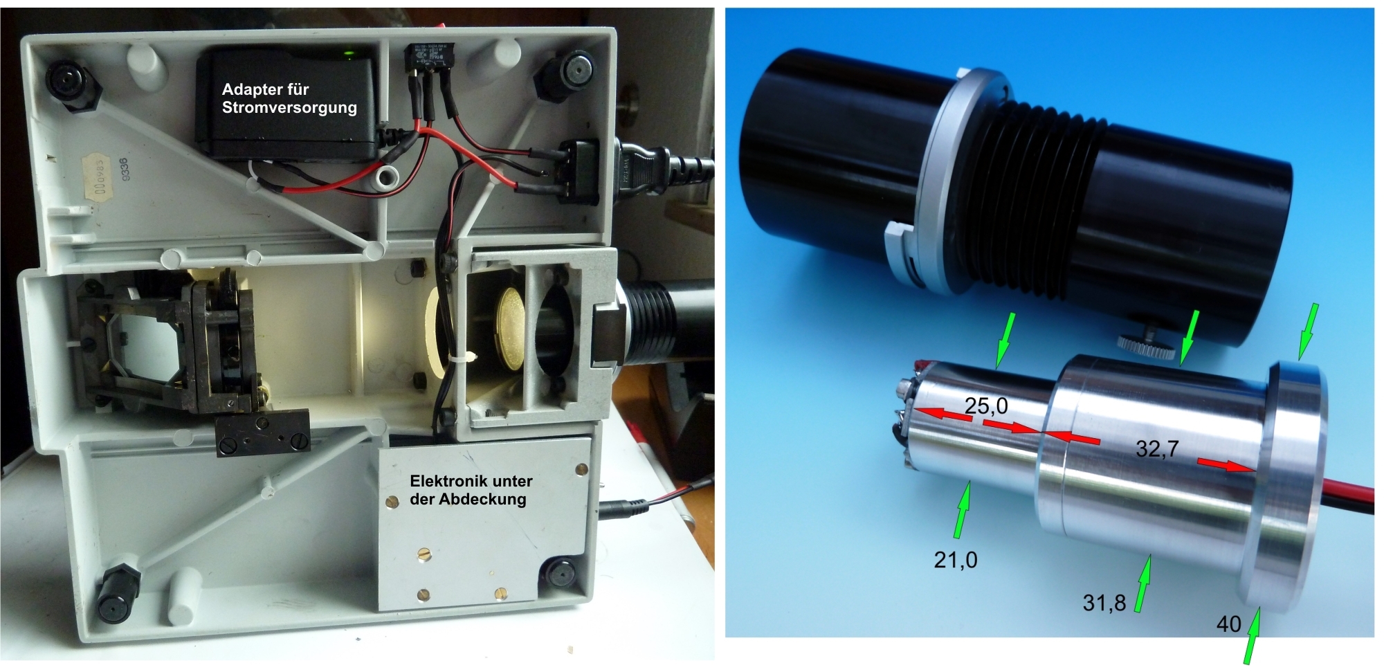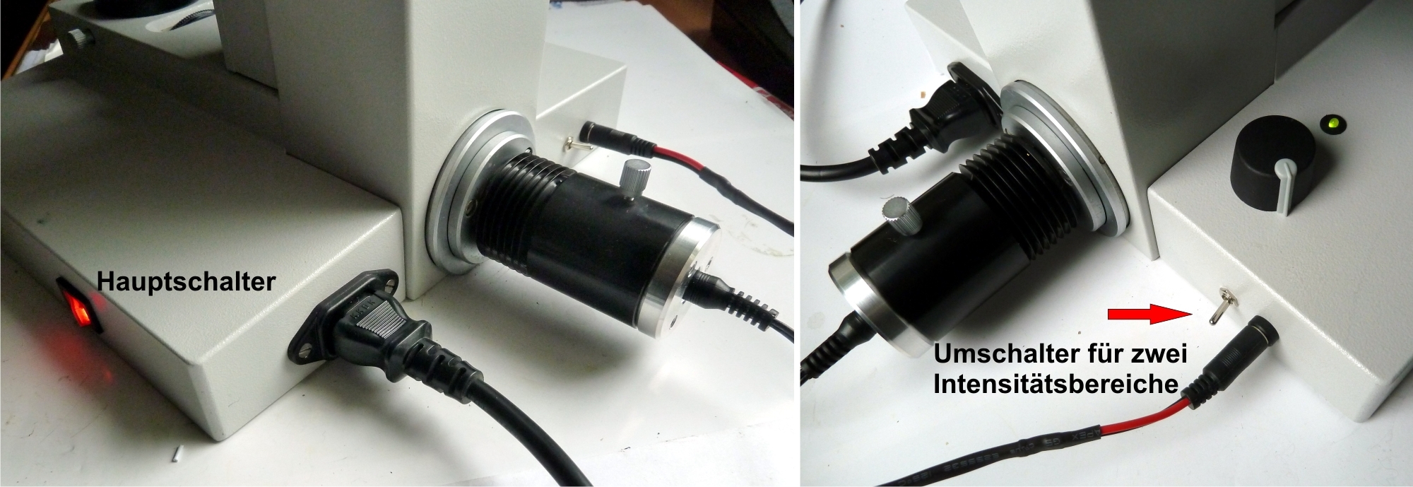 Mich stört wirklich, dass dadurch die Geräte verunstaltet werden, teilweise auch mit erheblicher Einschränkung der Funktionalität bei bestimmten Mikroskoptypen durch ungünstige Lage der großen Kühlkörper im Griffbereich wie z.B. dem Wild M20. Auch wurden in einem früheren Thread Streifenbildungen bei der Mikrofotografie durch die recht simple Schaltung beschrieben, ebenso eine m.E. viel zu "kalte" LED mit 6000 K