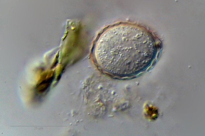 Die Rädertiere halten auch noch sehr tapfer durch und legen jede Menge Eier. Zumindest denke ich, dass es sich bei den folgenden Objekten um Rädertier-Eier handelt. Einige sehen zumindest welchen auf der wunderschönen Internetseite plingfactory.de ähnlich. Bei Bild 40 bin ich mir aber sehr unsicher, was es überhaupt sein könnte (doch evtl. etwas Richtung Schalenamöbe?) und auch bei dem orangenen Objekt auf Bild 37.