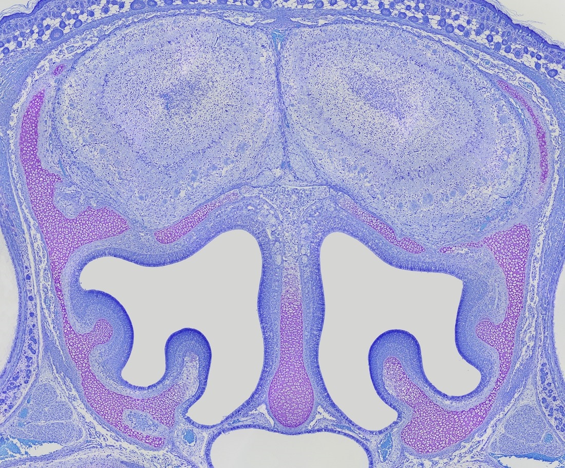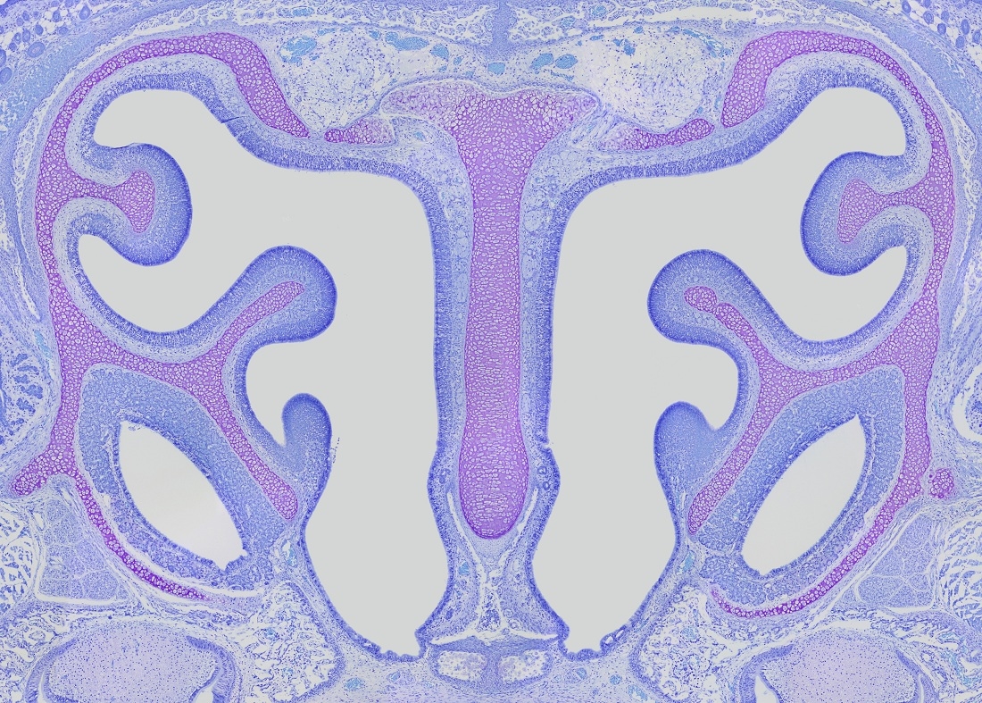 Dunkelblau ist die Nasenschleimhaut mit viele Riechzellen, Rosa ist Nasen Knorpel.
