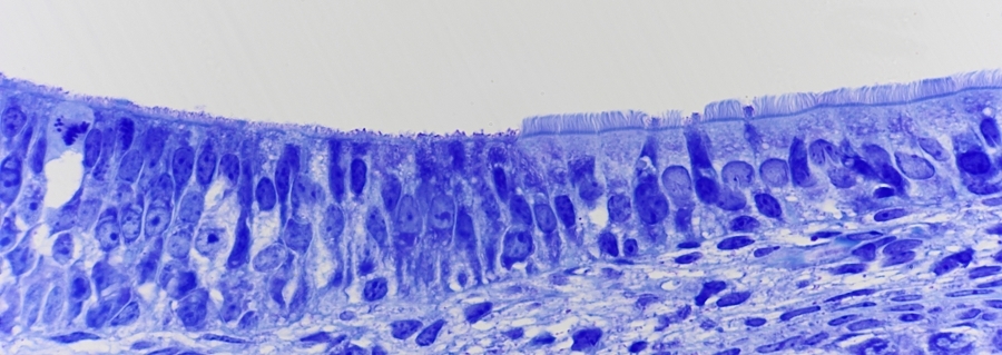 Bild 9, Übergangszone von Nasen Schleimhaut (Rechts) und Riechschleimhaut (Links).