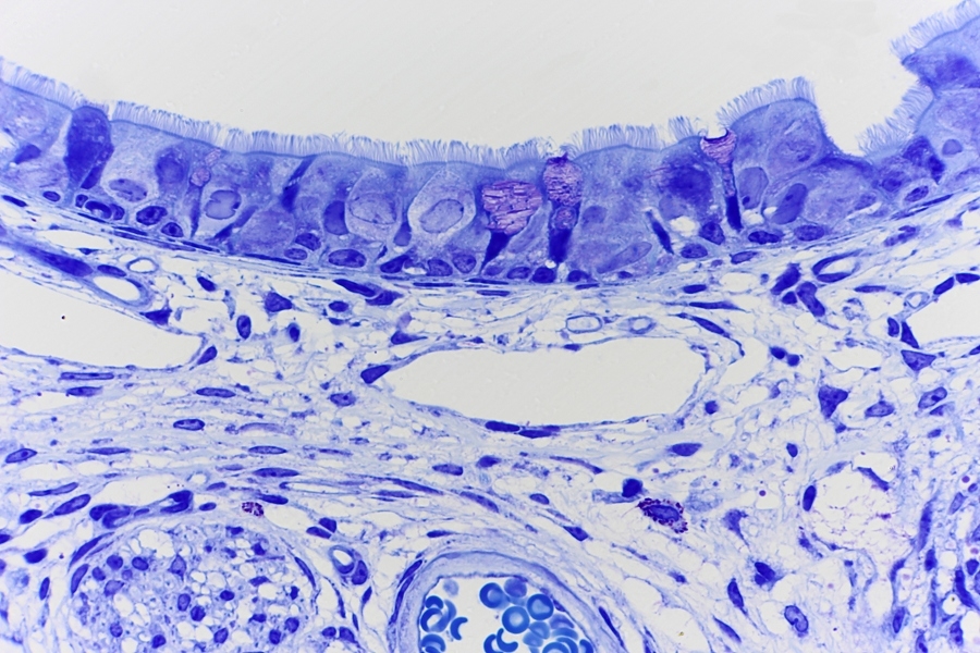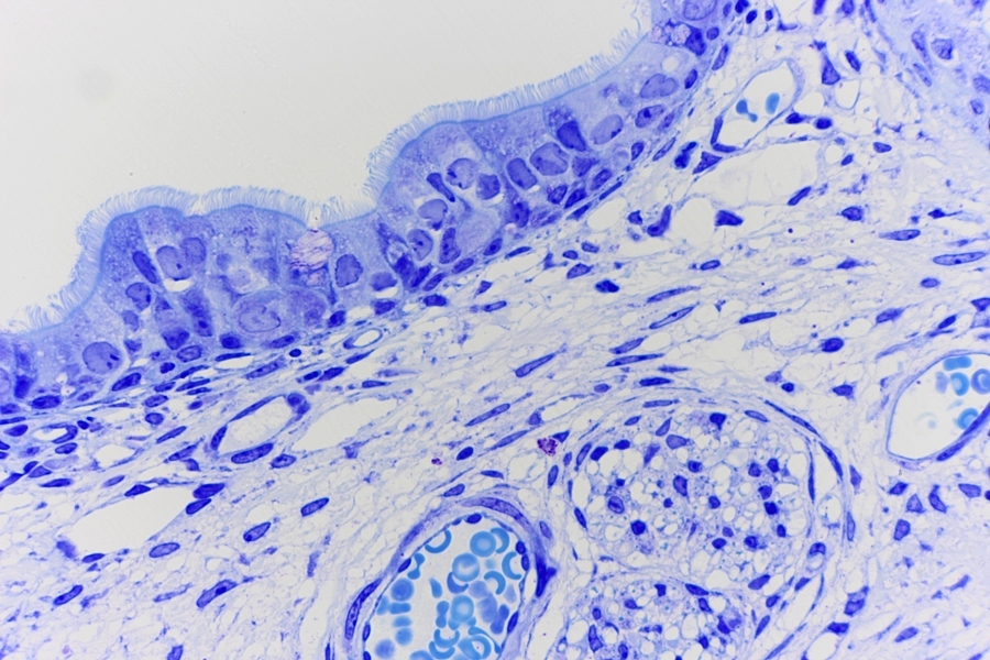 Ich sehe bei dieser Vergrößerung noch keine Becherzellen und kein Flimmerepithel. Liegt das nur an der Vergrößerung oder befinden die sich an anderer Stelle? Ich bin gespannt auf höhere Vergrößerung! Toll sind die methachromatischen Effekte des Toulidinblaus....
