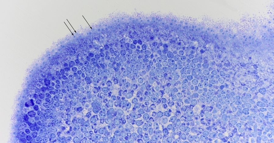 Da meine ich die ,Riechblaschen' zu erkennen wie leicht Blaue Tröpfchen (drei Pfeilen). Ob es aber wirklich so ist oder dass es nur ist was man hofft zu sehen kann ich nicht beurteilen. Am Mikroskop aber deutlich zu erkennen.