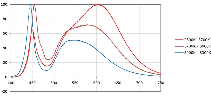 es bedeutet einen relativ großen Aufwand, das Lichtspektrum einer LED mit Filtern dem einer Halogenlampe oder gar des Sonnenlichtes anzunähern. Man mache sich mal die Mühe, die Datenblätter von LEDs zu konsultieren. Hier ein Beispiel von Cree. Während die Intensität einer Halogenlampe von Blau nach Rot ziemlich gleichmäßig (leichte S-Kurve) etwa auf das 3fache ansteigt, kriegen wird bei verschiedenen Cree XM-L-Typen das folgende (und andere Fabrikate sind ziemlich ähnlich):