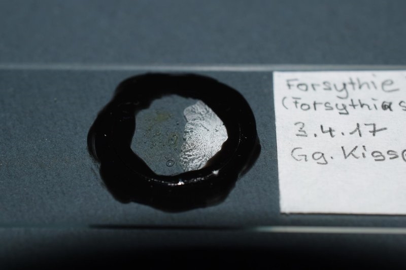Hugo:Meine Gelatine ist gekauft – noch bei CHEMLAB, kurz bevor Herr Heim(?) damit aufhörte. Ich nehme ein kleines Teil GG und lege es auf den Objektträger und erwärme es, bis die GG flüssig wird, dann Pollen draufgetupft, mit dem Deckglas abgedeckt, nach ein paar Tagen Rand säubern und Lack um das Deckglas herum gepinselt.