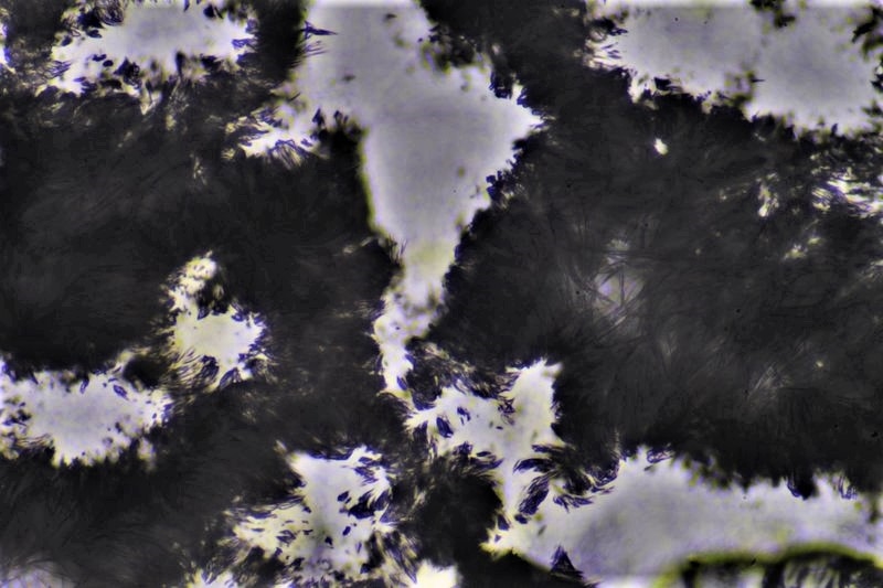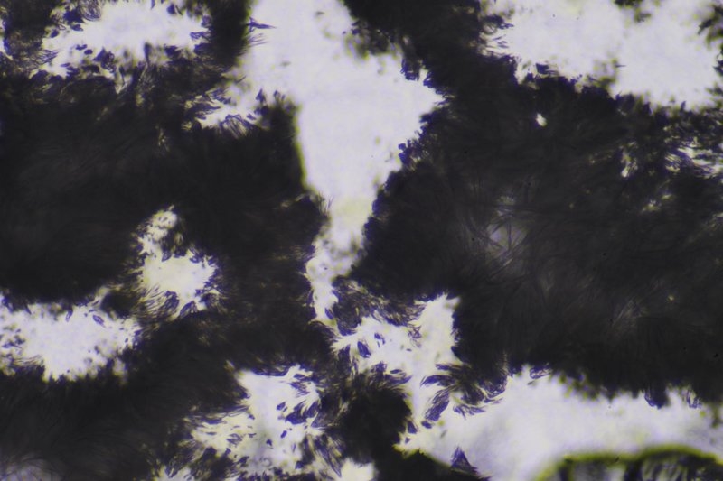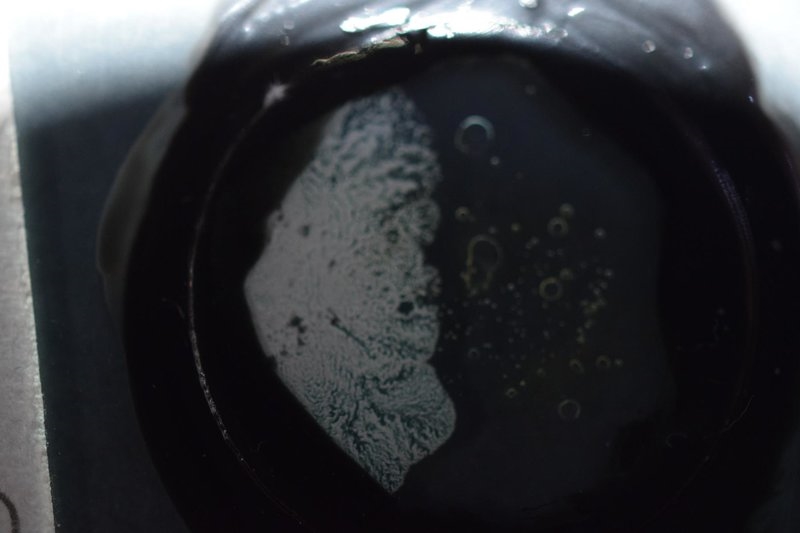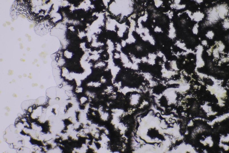 ich bräuchte mal die Hilfe der Experten zur Eindeckung von Präparaten. Meine Pollenproben habe ich immer in Glyceringelatine nach Kisser eingedeckt. Dabei habe ich folgendes Problem: nach einiger Zeit wächst ein Etwas vom Deckglasrand zum Zentrum hin und macht das Präparat unbrauchbar. Ich habe das Präparat immer nach einigen Tagen mit schwarzem Fingernagellack umrandet. Bei diesem Beispiel (Bild) besonders dick, um Lufteinschluss auszuschließen. Hat nichts genützt! ?