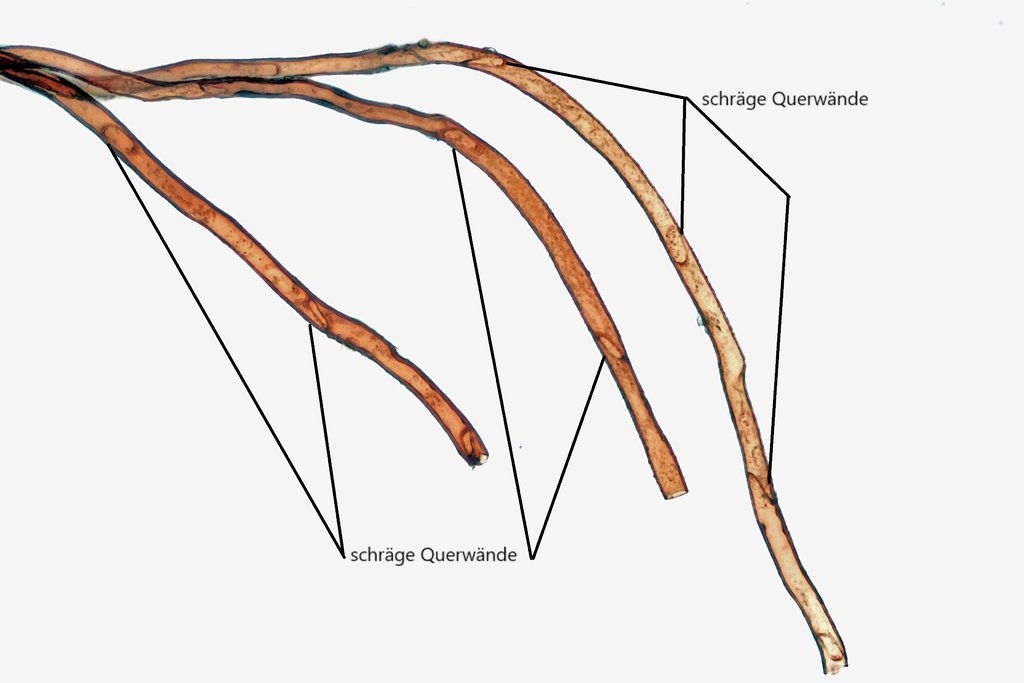 Bild13: Detailansicht der Rhizoiden mit schräggestellten Querwänden (Neofluar 16x)