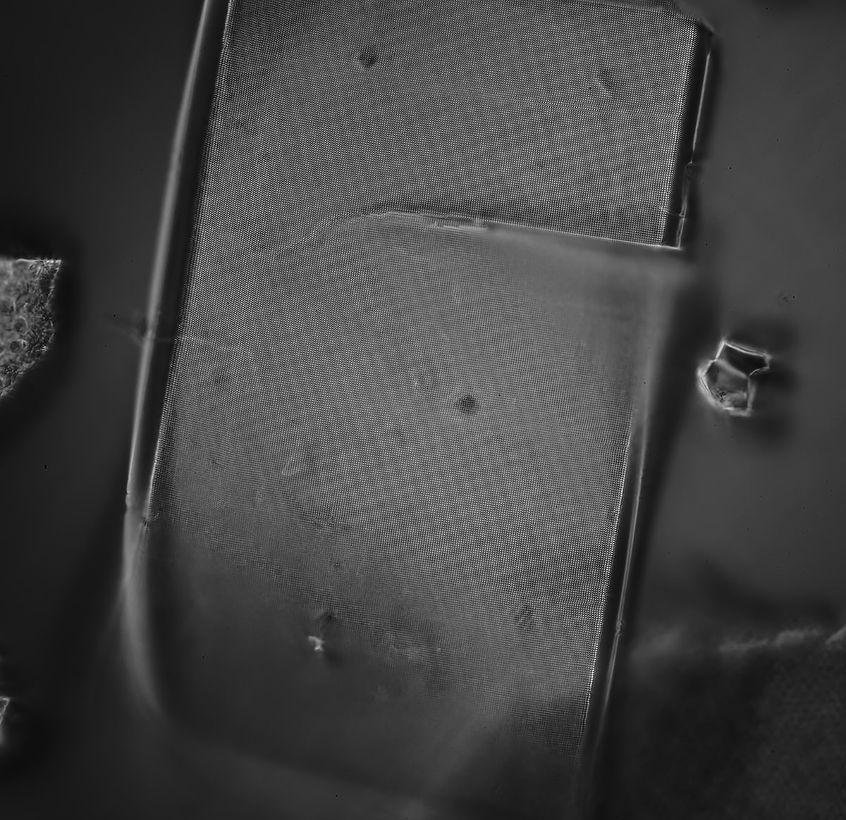 Wie man sieht, ist es auch bei 200x möglich, ein fast scharfes Bild zu erhalten. Die quadratischen Poren sind sogar noch als solche zu erkennen und verschwimmen nicht zu einem runden Beugungsscheibchen. Das liegt primär daran, dass sich die Struktur dieser Kieselalge (ist das denn überhaupt eine? Sie findet sich in so einigen Proben, die ich habe) fast immer hochkontrastig absetzt, nicht weit in die Tiefe geht und sie hier direkt unter dem Deckglas sitzt. Das geht eben leider nicht bei allen Motiven, da machen einem schnell andere Faktoren einen Strich durch die Rechnung. Als Beispiel kann hier Franks Beitrag mit den Radiolarien dienen - sie sind bei weitem größer, und doch durch ihre Struktur und die Linsenwirkung der Rundungen, ihrer Tiefe, Strukturarmut etc. ungleich schwieriger knackscharf abzulichten, vor seinen Ergebnissen ziehe ich meinen Hut!