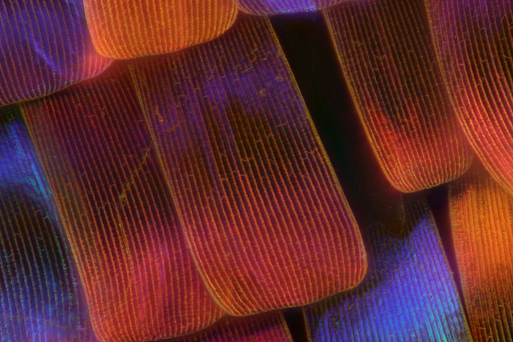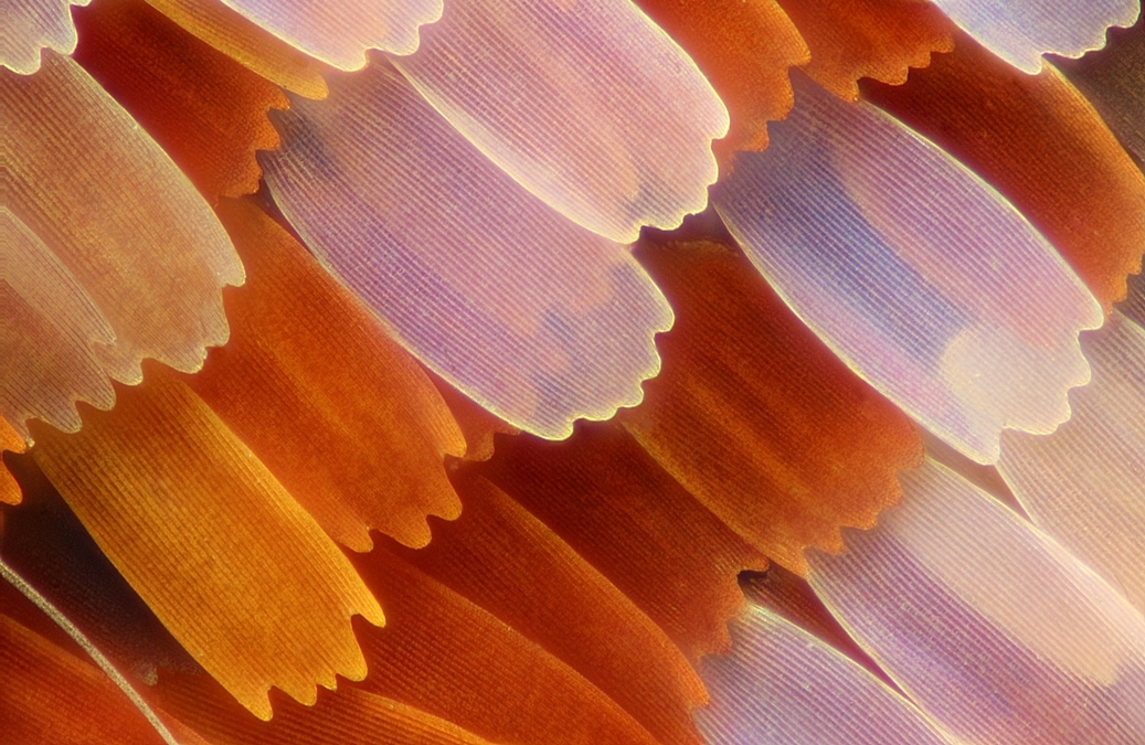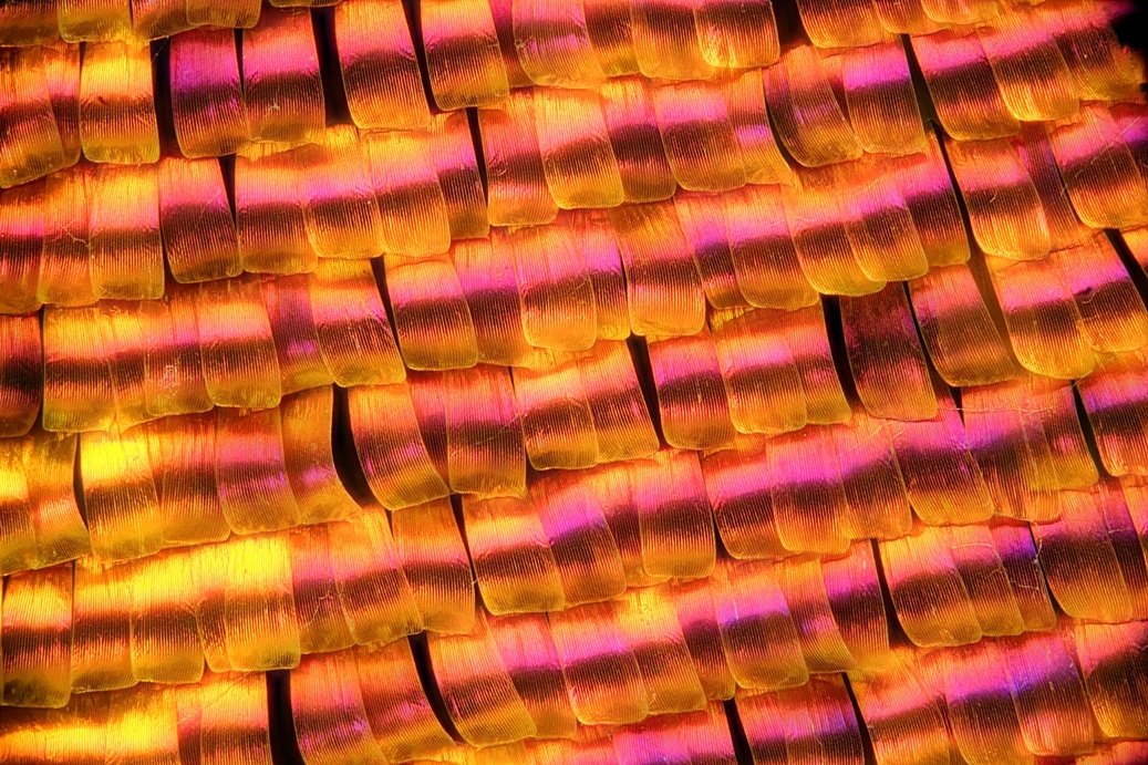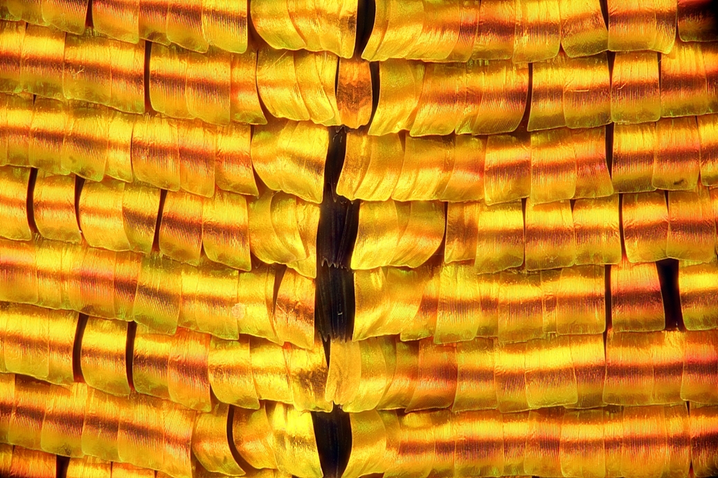 Da es ja allgemein um Schmetterlingsschuppen geht, hier nochmal zum Vergleich die Schuppen eines Tagpfauenauges. Ebenfalls mit dem 60er Nikon ELWD aufgenommen. Die Schuppen sind deutlich kleiner und meiner Meinung nach noch schwerer zu fotografieren.