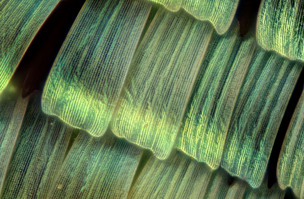 Die Elektronenmikroskopie liefert natürlich einen hinreißenden Detailreichtum. Allerdings bin ich der Meinung, dass schon die Lichtmikroskopie Wesentliches zu zeigen vermag. Man vergleiche einmal die letzte Aufnahme aus Annes Beitrag mit der ersten. In beiden Aufnahmen zeigt sich, wie die Flügelschuppe grundsätzlich aufgebaut ist. Es gibt eine Unter- und eine Oberlamelle, die durch pfeilerähnliche Streben, sogenannte Trabekel, miteinander verbunden sind. Die Oberlamelle weist zudem eine Art Höcker auf, die mal dünner, mal dicker ausgebildet sind.