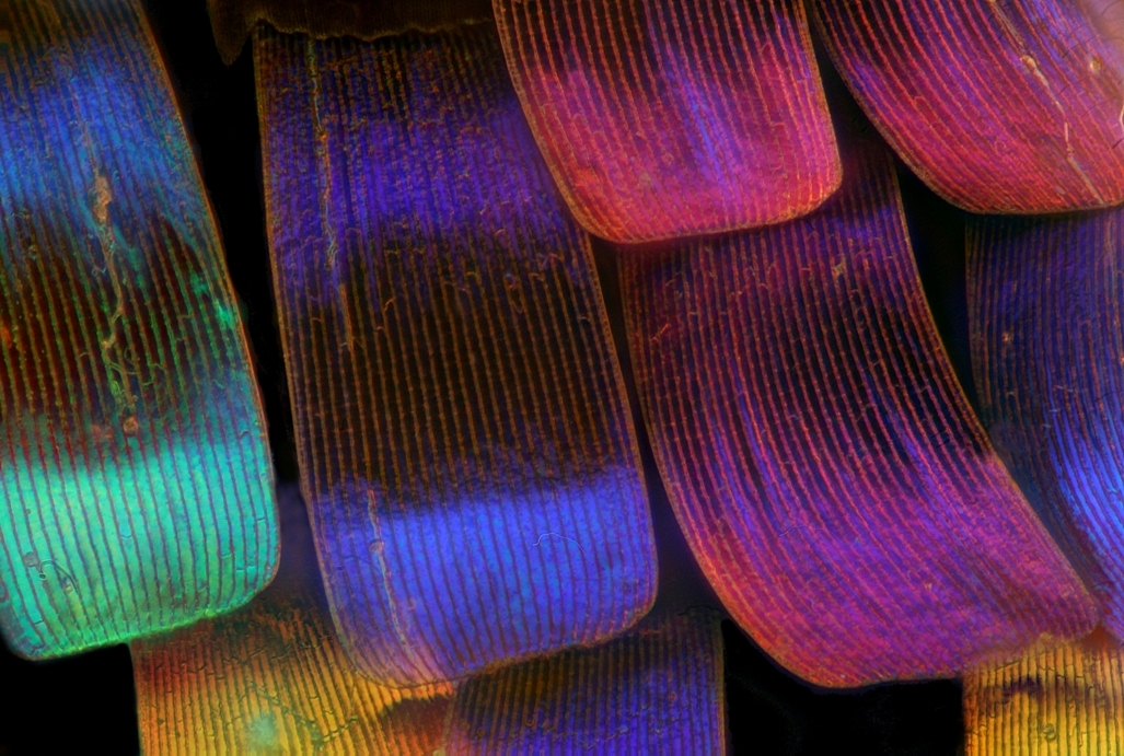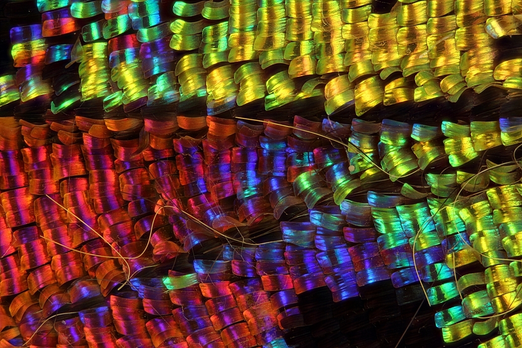 Bei der Fertigung des Präparates wird übrigens sofort klar, dass die Farbenvielfalt nur durch die Schuppenstruktur entsteht. Sobald ich nämlich ein Flügelstückchen in Xylol oder Paraffin eingetaucht habe, verschwanden alle Farben. Es blieb nur ein schmutziges Braun übrig.