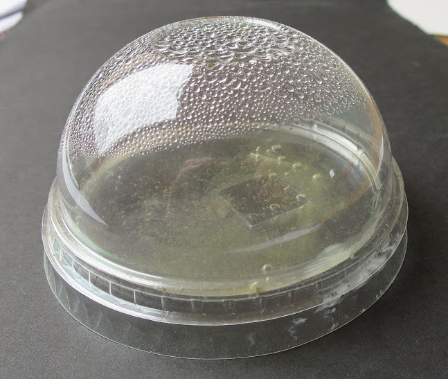 Hier ein "BioDom" (neue Worte für olle Kamellen sind immer wichtig) mit schwimmenden Deckgläsern im Inneren eines Deckels eines Kaffebechers und rundem Deckel eines Minitomatenbehälters.