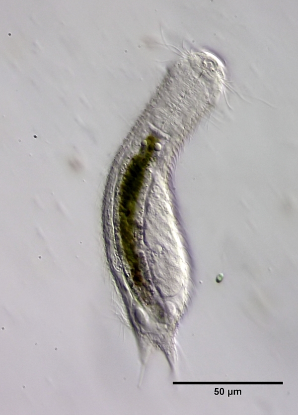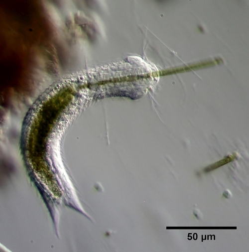 REM-Aufnahmen von Gastrotrichen existieren zwar, sind aber recht selten und meist unansehnlich, da die Tiere die Trocknung (oder sonstigen Präparationsschritte) schlecht vertragen. Aber das oben beschriebene Fressverhalten ist die absolute Ausnahme bei Gastrotrichen. Du hast sicherlich schon eine Menge Gastrotrichen gesehen, aber ich wage zu bezweifeln, dass deren Darminhalt Algenfäden zeigte (Du hattest natürlich keinen Grund darauf zu achten). Wenn man sich z.B. die Sammlung von Gastrotrichen-Bildern von Michael Plewka ansieht, wird man nicht eine Art finden, die diese Nahrung annimmt.