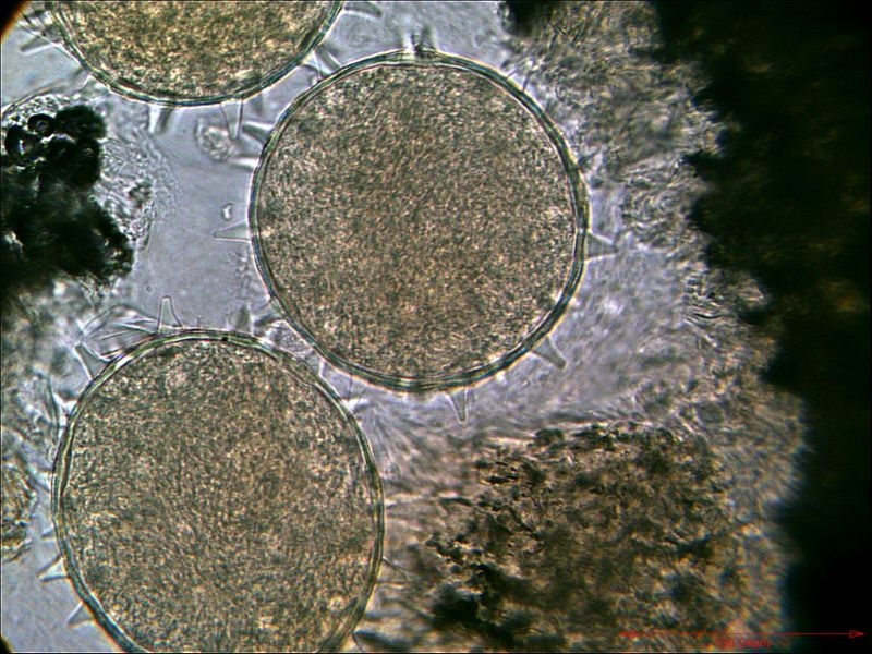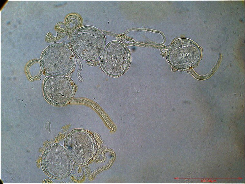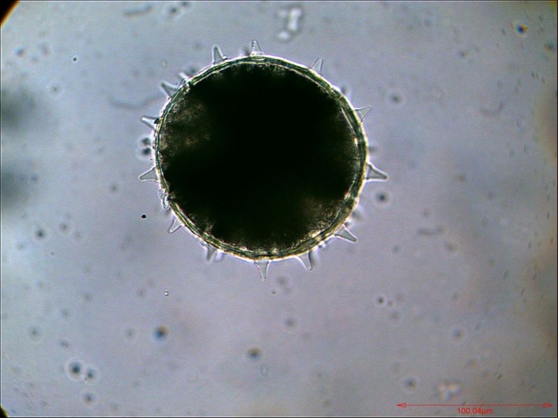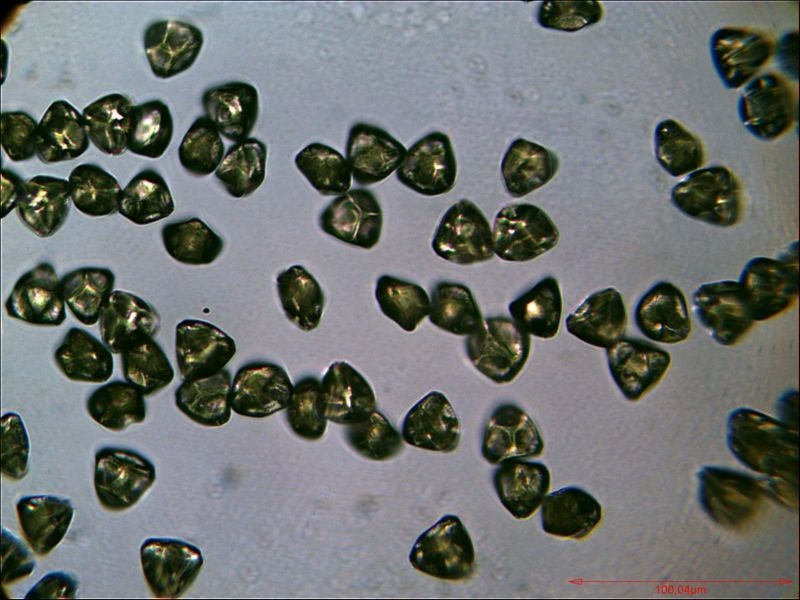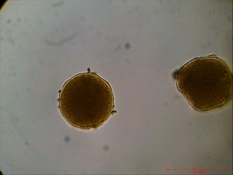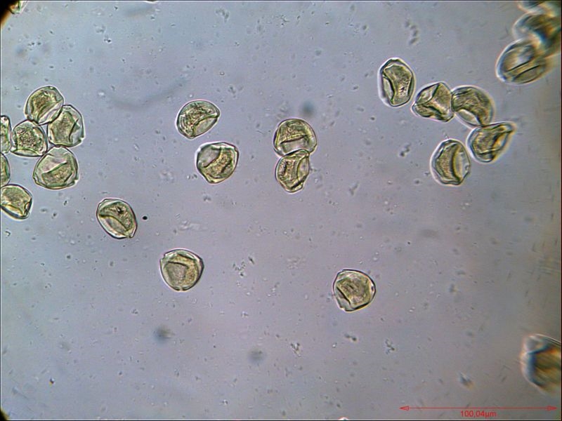 Das Bild zeigt rezente, unbearbeitete Pollen von Chelidonium majus (Schöllkraut) im Entnahmezustand, Längsausdehnung ca. 20 µm. Bitte nicht hauen, das Mikroskop heißt Lomo Biolab in der einfachsten Ausstattung. Ich höre auch schon die Proteste, aber das ist tatsächlich Pollen vom Schöllkraut und nicht von Scharbockskraut.