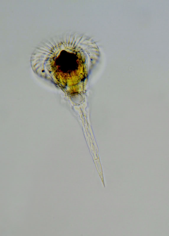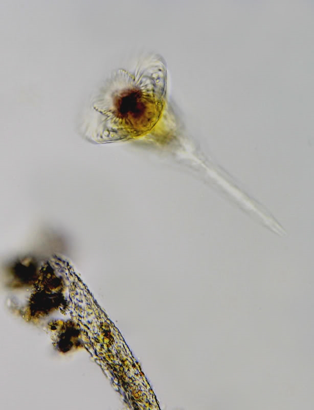 sogleich wiedererkannt: das Rädertier Microcodon clavus, frei schwimmend. Gefunden in einem Teich auf der Trupbacher Heide bei Siegen.