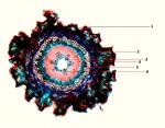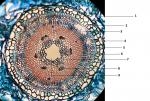 2. Foto: 3 = zerrissenes Phloem, 4 = Kambium, 5 = Phloem, 6 = Metaxylem, 7 = Protoxylem, 8 = Sklerenchymbündel, 9 = Markhöhle, 1 = Schuppenblätter/Brakteen, 2 = Phellem.