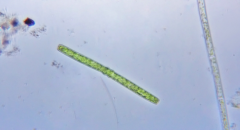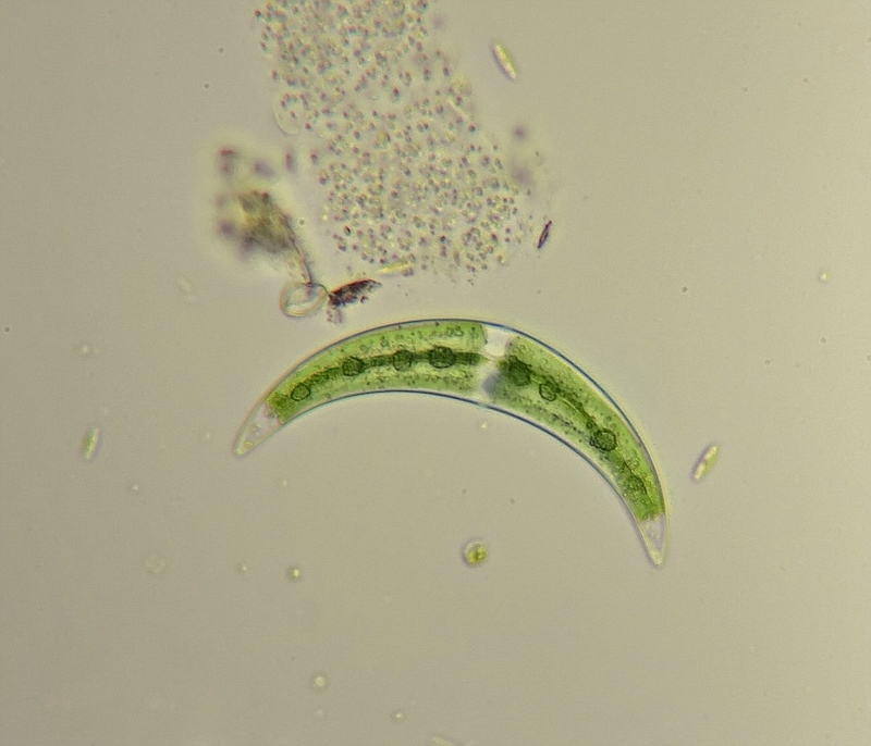 deine Bilder erinnern mich mit Rührung an mein botanisches Großpraktikum vor nunmehr 40 Jahren - alles Algen, die man damals zeichnen musste (den Wasserfloh Daphnia mal ausgenommen, der gehört ins zoologische GP). Du hast hier Mougeotia (die Chloroplasten können sich je nach Lichtintensität verdrehen und diese Algen haben Sex wobei sich zwei Algenfäden aneinander legen) und Closterium moniliferum (die Halbmonde - auch die können sich paaren), auch eine Micrasterias-Art ist vertreten.
