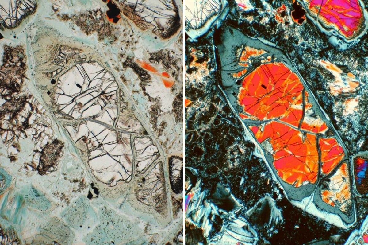 Dünnschliff: Fossil oder Kristall im Turmalin-Pegmatit (Neoproterozoikum)?