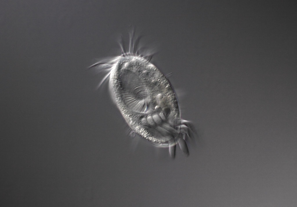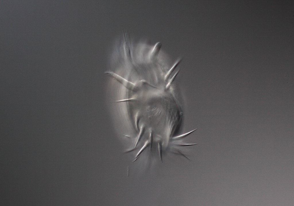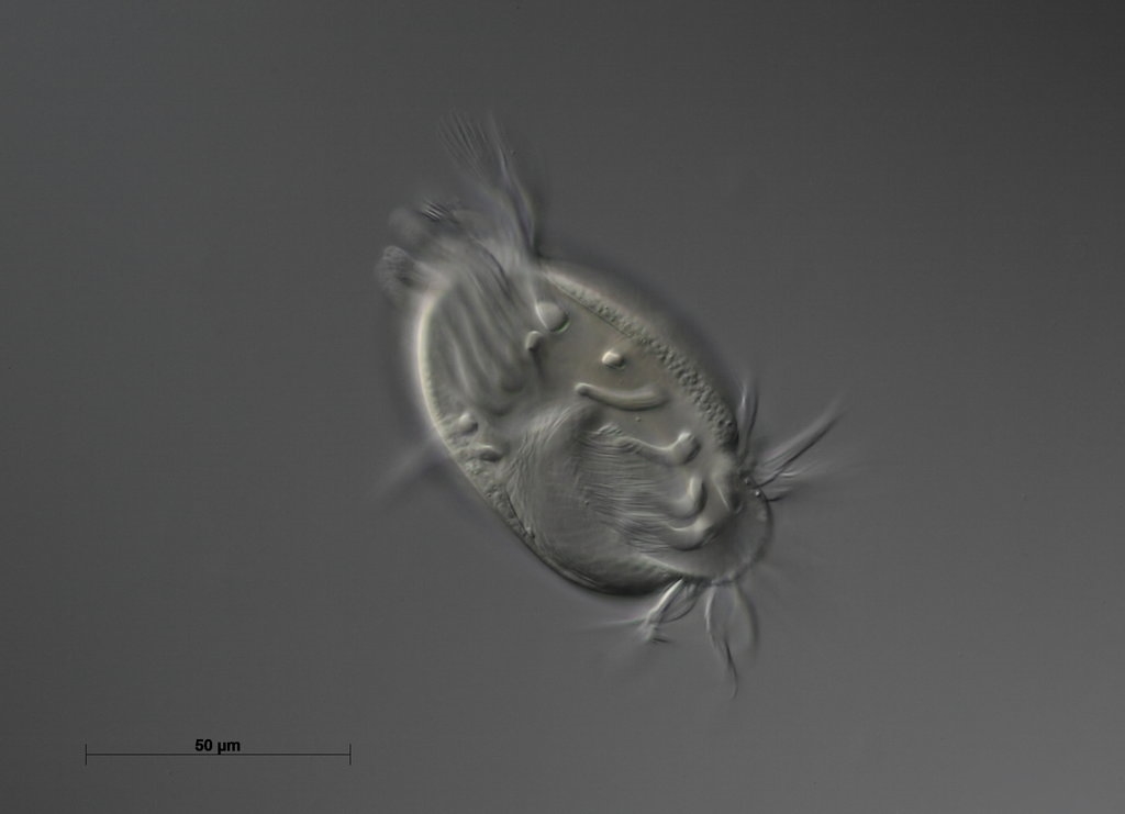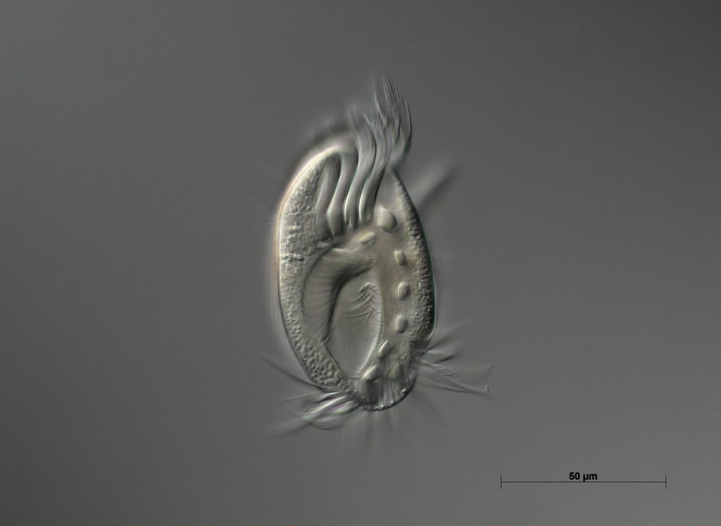 Das Viech ist so um die 80-85 µm lang, ohne Fortsätze, mit Fortsätzen (Schwanzcilien) ca. 100-110µm.