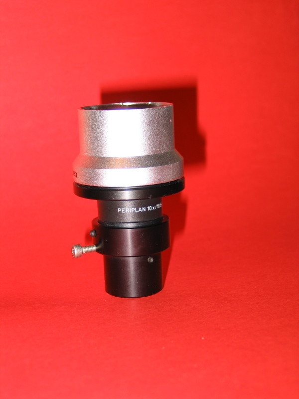 Da ich zwei Periplan 10X/18 Brille-Okulare (mit Gewinde für die Augenmuschel) habe, diese gehören zu Leitz-Mikroskopen mit ,,Endlich-Optik" und ,,Tubuslänge" 160 mm, überlege ich, mit einem der Okulare eine derartige Kamera-Adaption an einem Leitz-Mikroskop mit Tubuslänge 160 mm auszuprobieren. (Ich denke dabei an eine Digital-Kamera, die direkt ein Bild auf dem Computer liefert und auch vom Computer aus für Video-Sequenzen und Bilder ausgelöst werden kann. )
