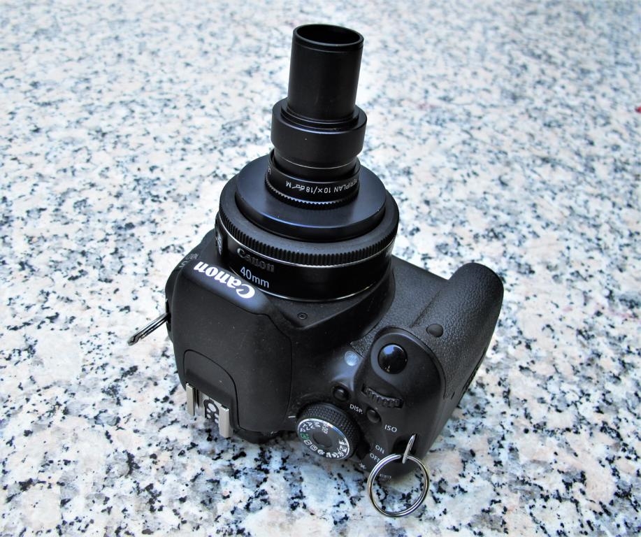Wenn ich es richtig verstanden habe, gibt es fertige Teile für eine einfache Adaption einer (Canon-) Kamera mit passendem Objektiv (Pancake), wobei die vorhandenen Gewinde am Periplan-Okular und an der Kamera/bzw. dem Objektiv genutzt werden. (Wie ich beim genauen Hinsehen festgestellt habe, zeigen deine Bilder ein Periplan 10X/18 Brille M, also auch ein Periplan-Okular für die Tubuslänge 160.) Stimmt denn der Abstand bei der gezeigten Adaption zwischen der Okular-Austritts- und Kameraobjektiv-Eintrittslinse?