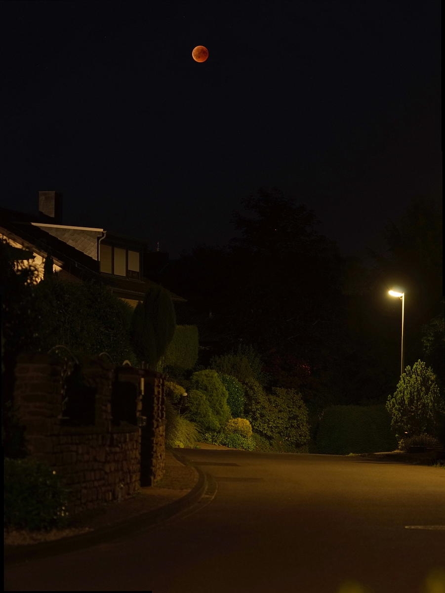 wir konnten uns gestern abend den Mond ganz gut ansehen. Nicht die Verfinsterung, aber ab der beginnenden Entfinsterung. Wunderschön fand ich ihn, als er langsam wieder Licht bekam, da sah er wie eine rauchgefüllte Glaskugel in orangem Licht aus. Wir hatten nur ein Kinderteleskop, das sich aber drei guten 10x50 Ferngläsern geschlagen geben musste. Sogar ein altes Zeiss Dienstglas von 1944? kam zum Einsatz.