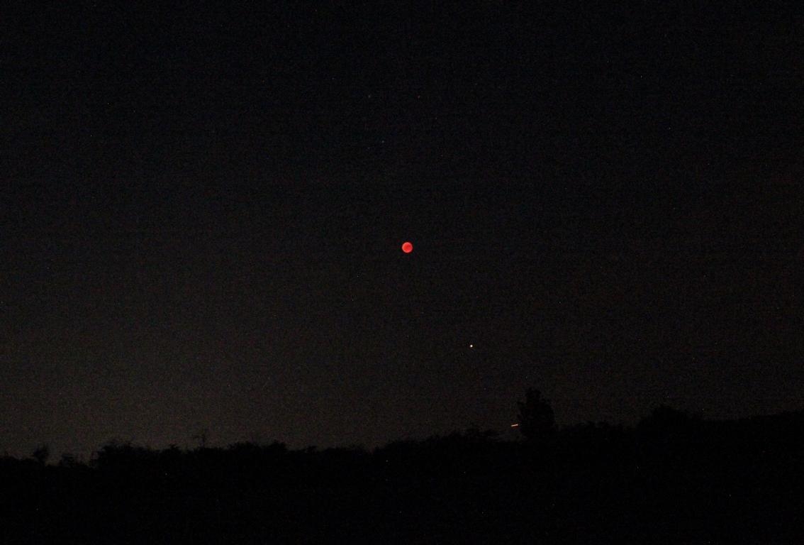 gegen solche Traumbilder komme ich natürlich nicht an, aber weil bislang keiner den Mond und Mars zusammen abgebildet hat trau ich mich doch.. Bei uns war leider ein Wolkenschleider vor der Herrlichkeit, so dass man nur mit der Kamera bei 6400 ISO was gesehen hat. War schon schwierig den Mond überhaupt zu finden. Mein "Riesen"-Tele 135 mm lässt den Mond natürlich als Erbse erscheinen. Der einzige Vorteil: der Bildausschnitt ist so groß, dass der rechts unterhalb liegende Mars auch noch drauf war. Na und extra dafür ein 400er Tele zu kaufen, das ich sonst nie brauche war mir dann doch zu kostspielig.