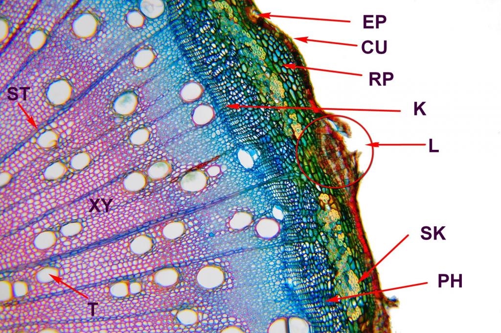 ST = Strahl, T = Trachee, XY = Xylem, EP = Epidermis, Cu = Cuticula, RP = Rindenparenchym, K = Kambium, L = Lentizelle, SK = Sklerenchym, Ph = Phloem