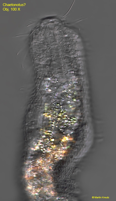Das letzte Fotos zeigt das schon ziemlich geplättete Exemplar. Für mich ergeben die beiden keine Organe keine interpretierbaren Strukturen. Aber ich habe auch nicht viel Erfahrung mit den Gastrotrichen.