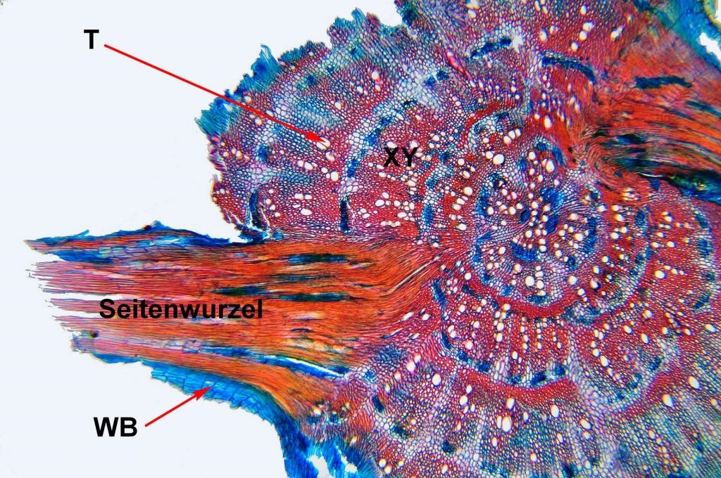 T =Trachee, WB = Weichbast (Phelloderm), XY = Xylem, Seitenwurzel