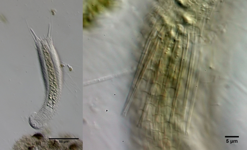 Das Tier fällt vor allem durch die extrem langen, biegsamen Kleberöhrchen auf (Bild 3, oben). Diese sind bei dieser Art aus ca. 18-23 zueinander beweglichen Ringen zusammengesetzt. Bei den anderen Gastrotrichen-Gattungen sind die Kleberöhrchen unbeweglich und bestehen lediglich aus einem einfachen Rohr.