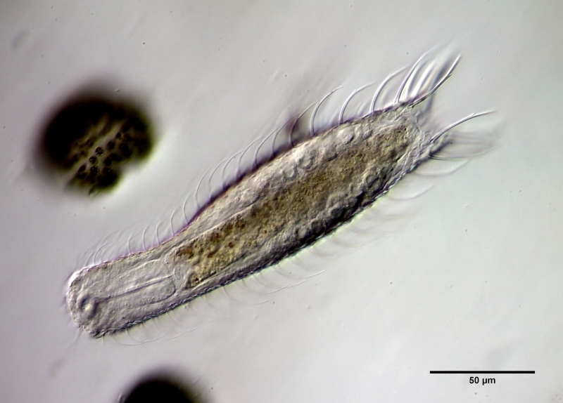beim diesjährigen Treffens auf dem Dörnberg konnten wir eine reichhaltige Tümpel-Probe untersuchen, die Ralf und Thilo in einem nahe gelegenen Waldsee geschöpft hatten. Da einige Teilnehmer sich Mikroaquarien von dieser Probe erstellt haben, die - hoffentlich - immer noch intakt sind, glaube ich, dass in diesen Präparaten einige Bauchhärlinge aufgetaucht sind. Da die Artbestimmung bei Bauchhärlingen für den Unerfahrenen meist sehr problematisch ist, möchte ich für die Bauchhärlinge, die ich in meinen Präparaten entdeckt habe, einen kurzen "Steckbrief" angeben und auf die Besonderheiten dieser Gastrotrichen hinweisen. Vielleicht hat dann der eine oder andere mehr Freude an seinen Mikroaquarien, wenn er mehr über die beobachteten Arten weiß. Im Folgenden führe ich die wahrscheinlich auch bei Euch beobachtbaren Gastrotrichen-Arten der Größe nach geordnet auf.