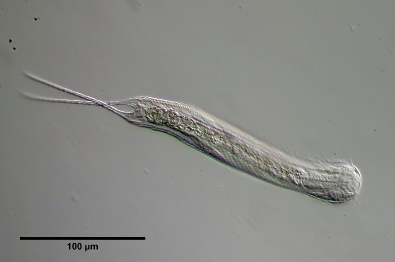 Mit C. persetosus sind wir bei den kleinen Gastrotrichen angelangt, bei denen naturgemäß die Bestimmung immer schwieriger wird. Die Exemplare in den Dörnberg-Präparaten sind etwas größer als die obige Literaturangabe (ca. 120µm). Dennoch bin ich mir recht sicher, dass es sich hier um die Art C. persetosus handelt. Alternativ wäre noch die Art C. macrochaetus möglich, die zwar der Größe mehr entspricht aber auch mehr Schuppenstacheln trägt.