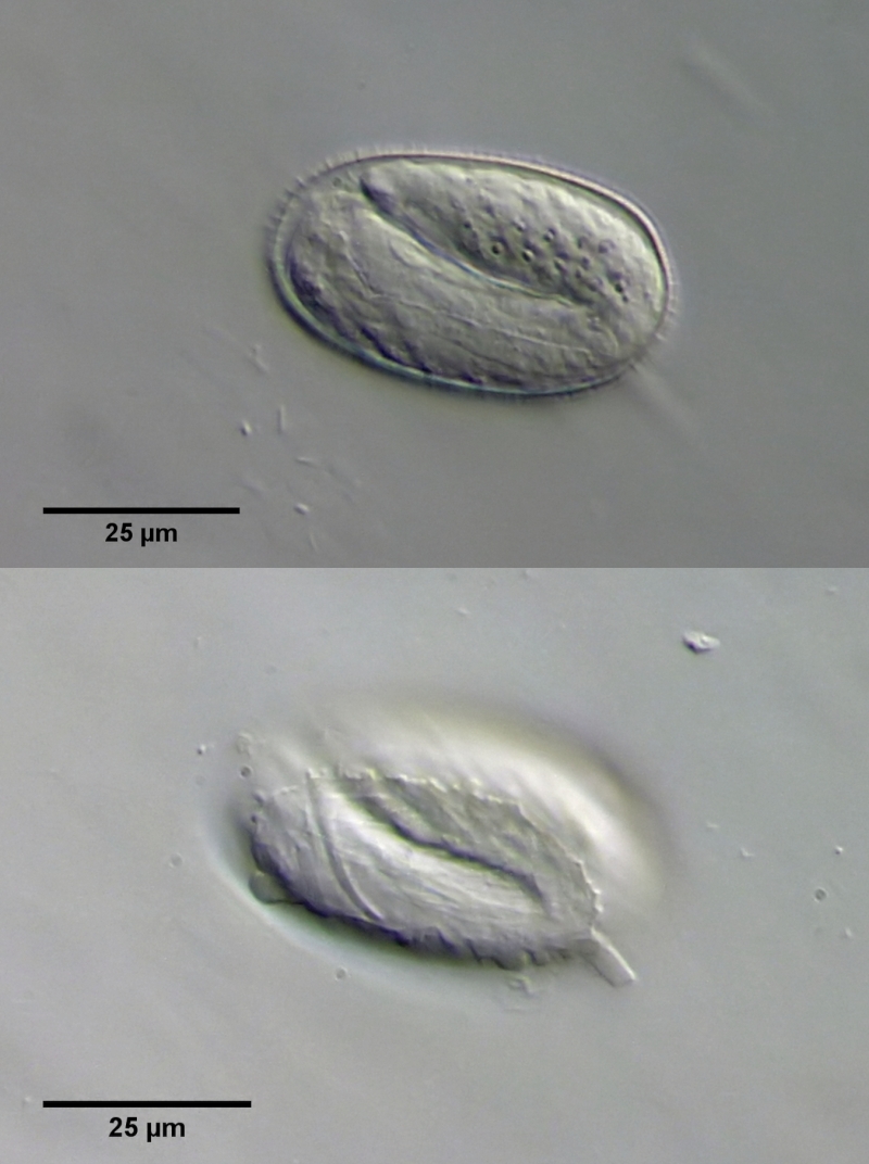 Bild 11: C. persetosus; Eier, oben Querschnitt, unten Fokus auf Klebefläche